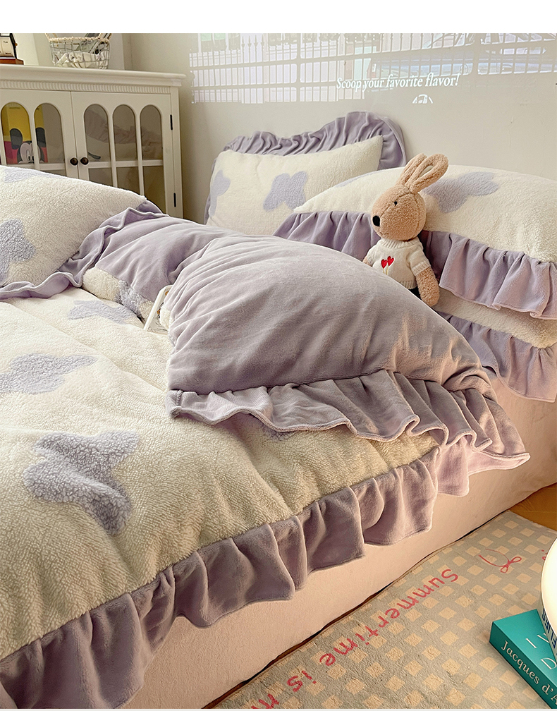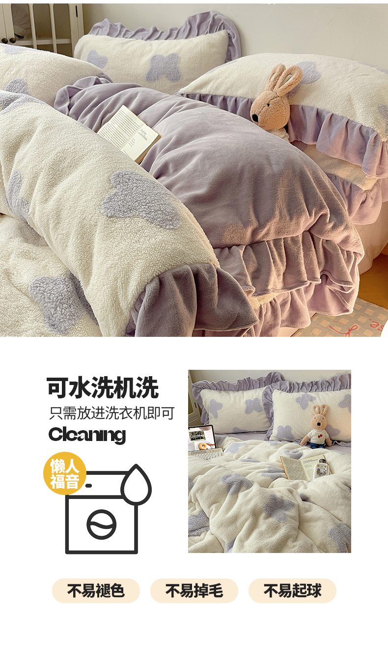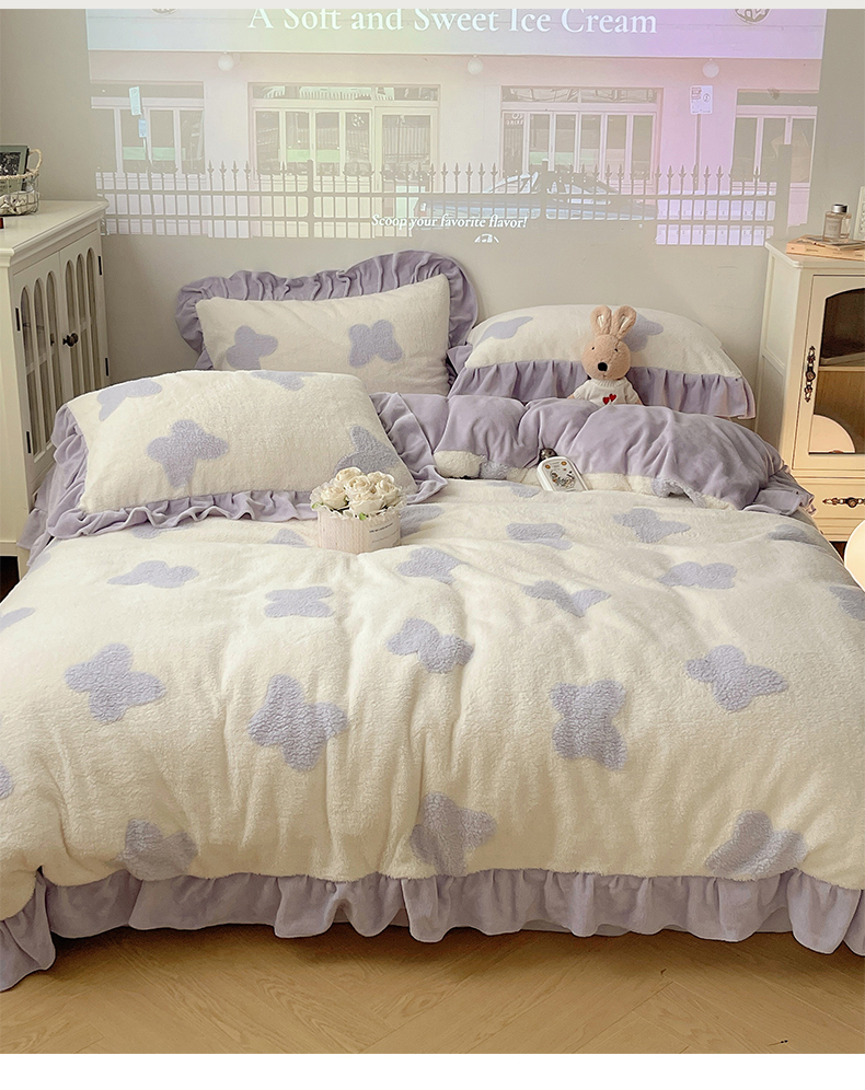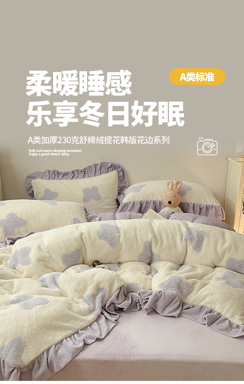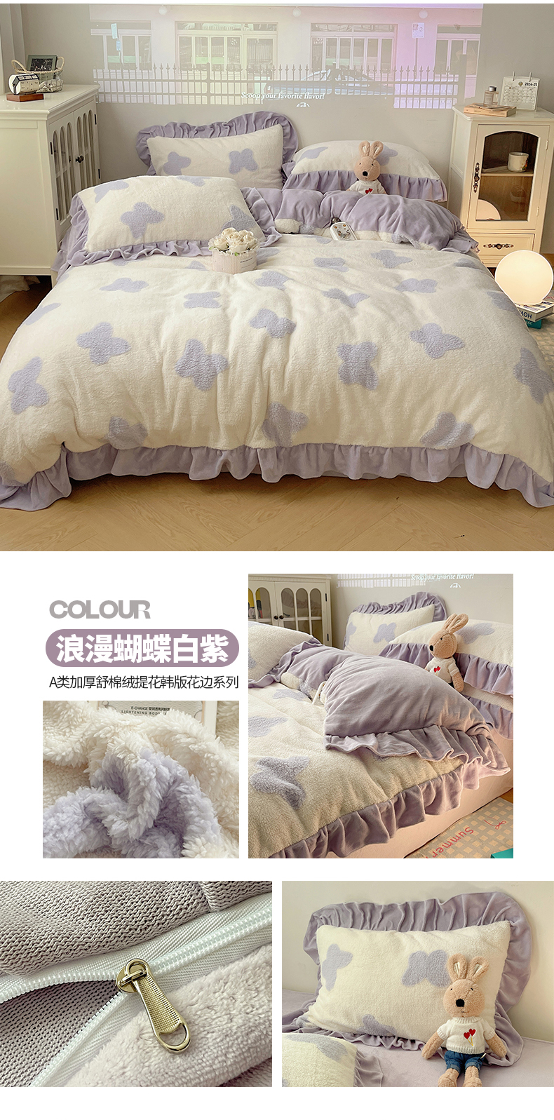当前位置: 91家纺网 > 商品网购 > 床品套件 > 四件套 > 牛奶绒四件套 > 桃子家居 2024新款A类加厚230克色纱提花蝴蝶少女花花韩版花边舒棉绒牛奶绒系列四件套 舒棉绒花边-浪漫蝴蝶白紫