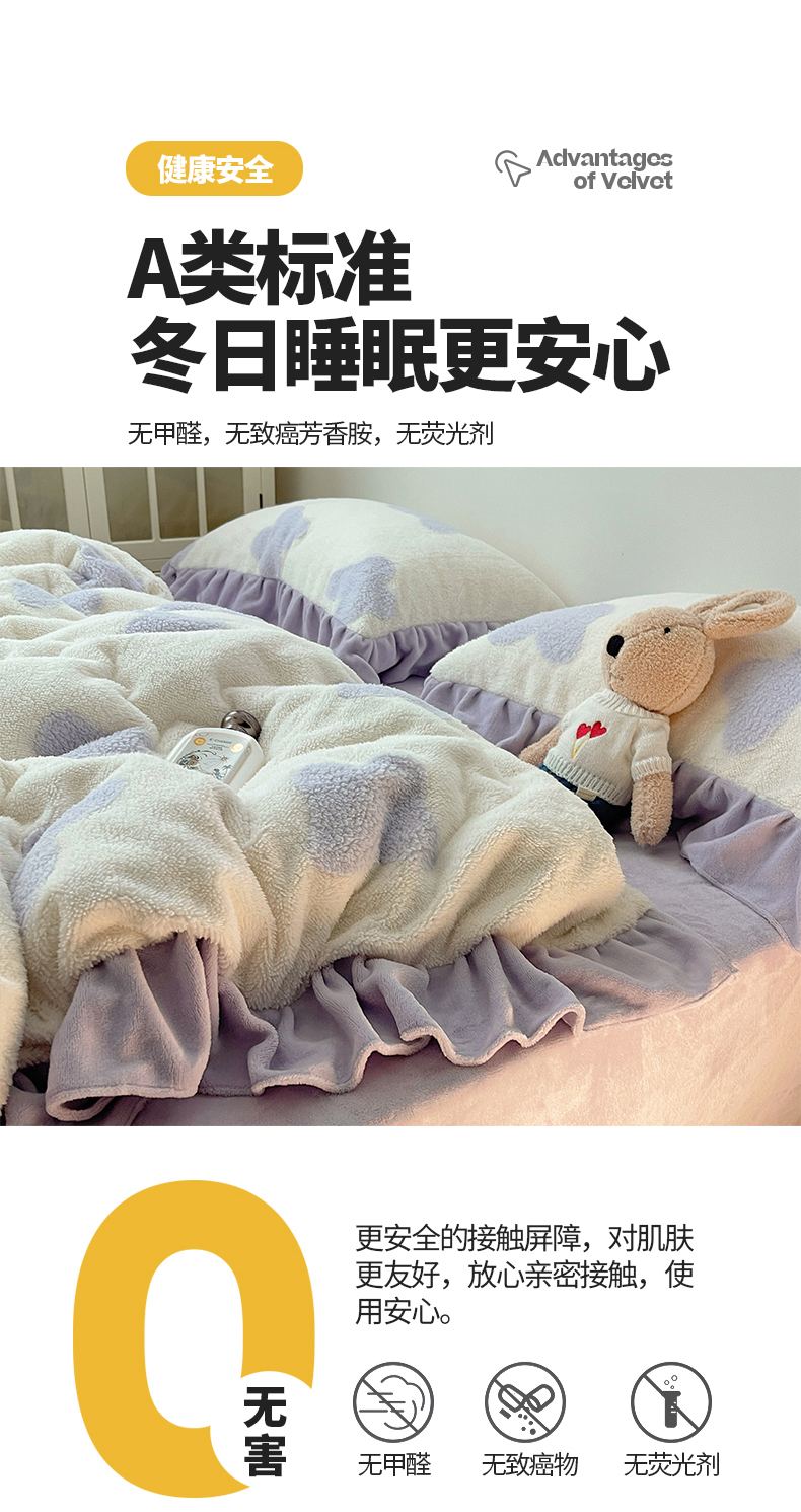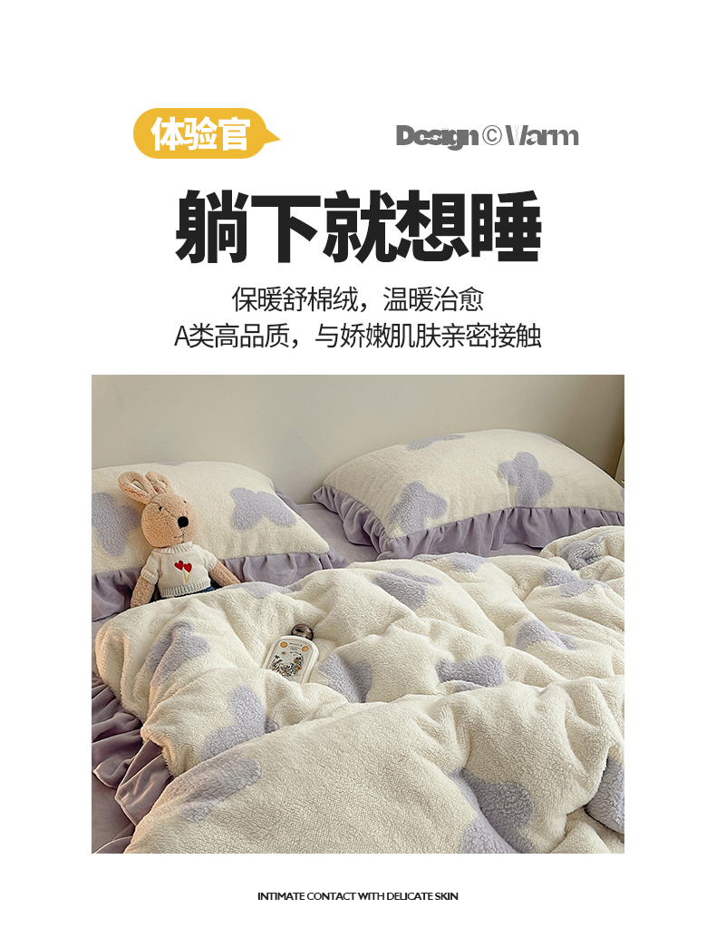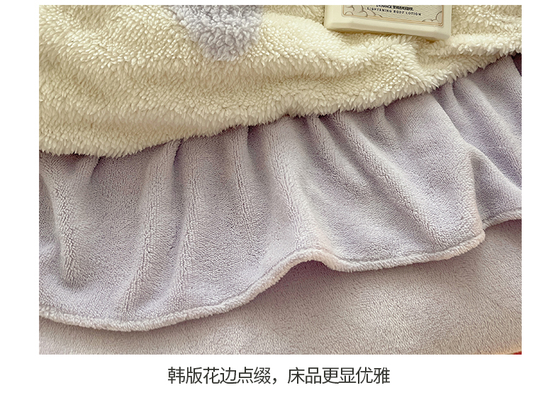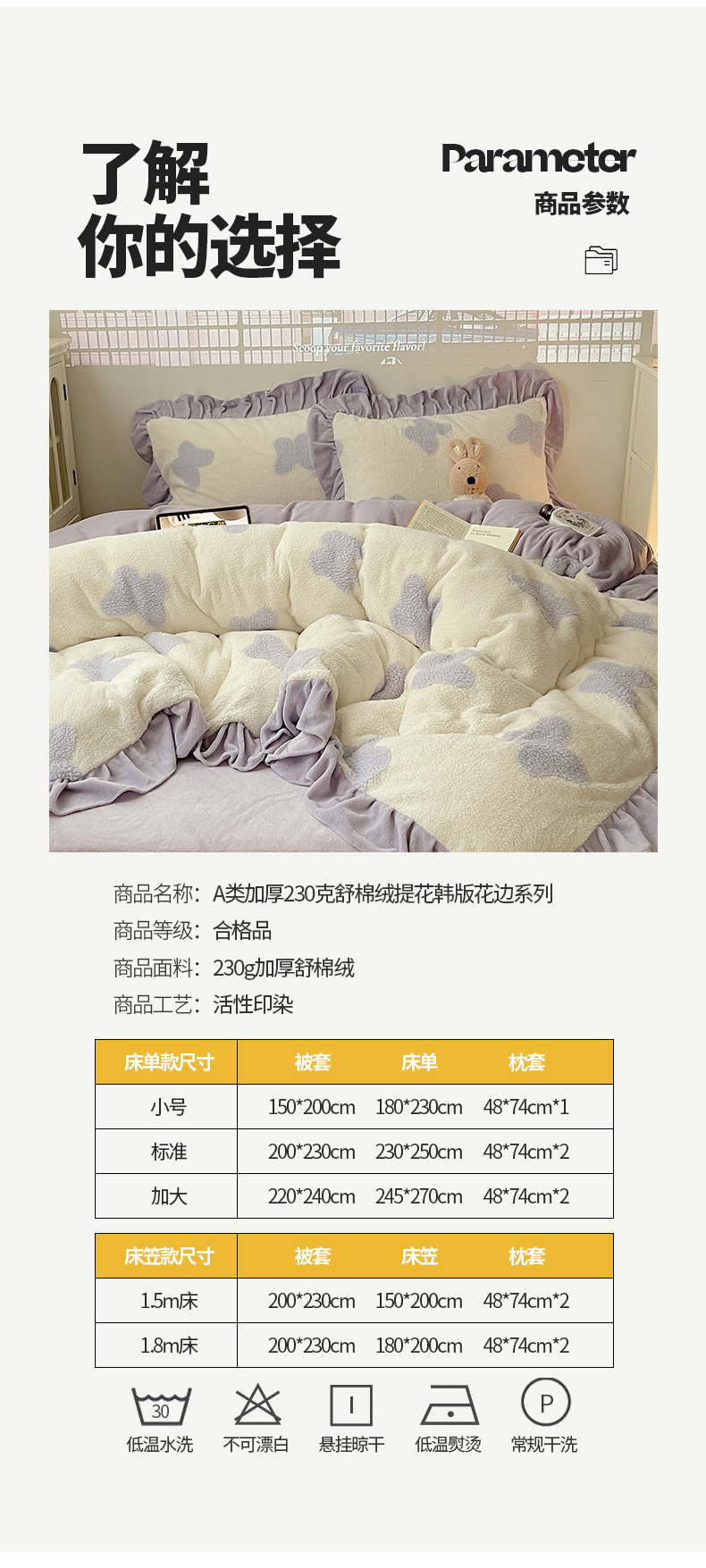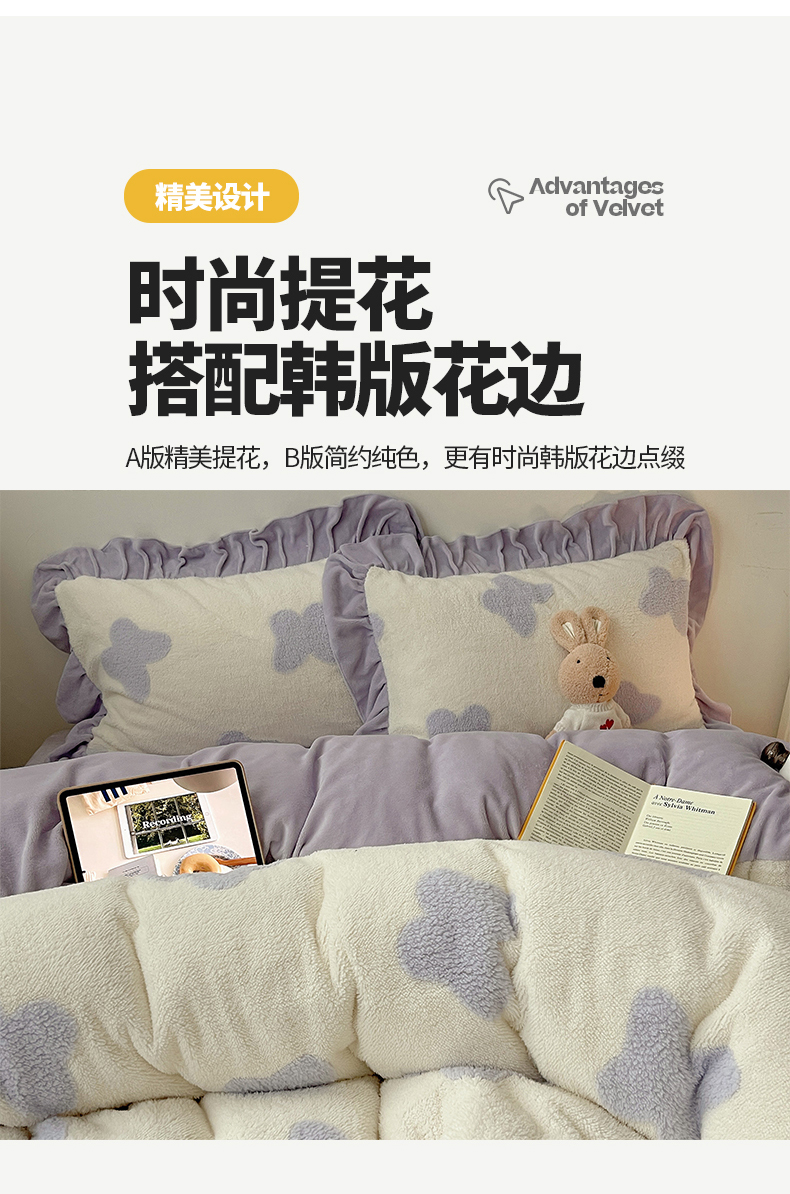 当前位置: 91家纺网 > 商品网购 > 床品套件 > 四件套 > 牛奶绒四件套 > 桃子家居 2024新款A类加厚230克色纱提花蝴蝶少女花花韩版花边舒棉绒牛奶绒系列四件套 舒棉绒花边-浪漫蝴蝶白紫