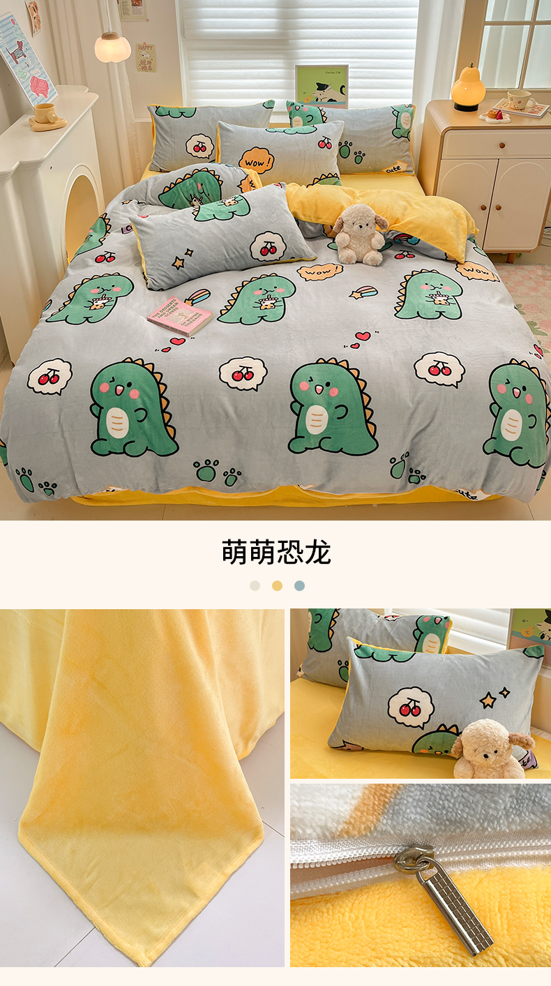 当前位置: 91家纺网 > 商品网购 > 床品套件 > 四件套 > 牛奶绒四件套 > 孩子王家纺 2025新款小清新冬季加厚牛奶绒水晶绒珊瑚绒印花系列四件套 萌萌恐龙