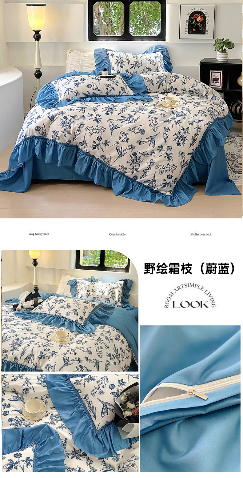 商品名称:春光里 2024新款法式大花边亲肤磨毛四件套 野绘霜枝(蔚蓝)