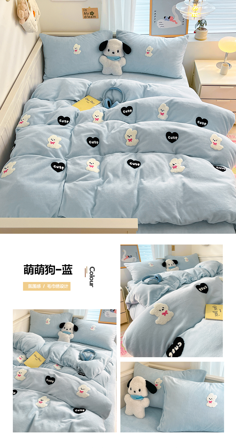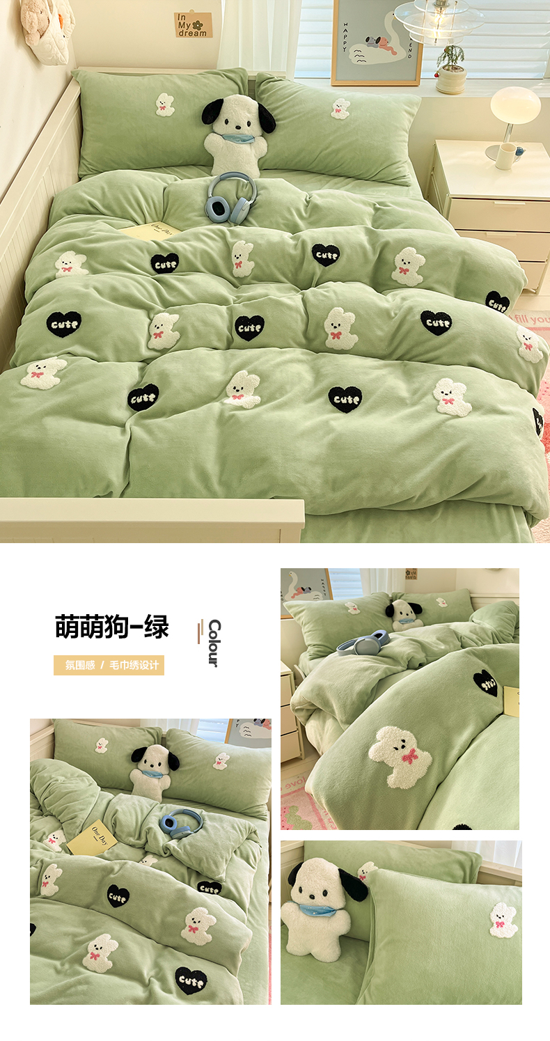 商品名称:亨通家纺 2024新款牛奶绒毛巾绣四件套系列-萌萌狗 萌萌狗-果绿