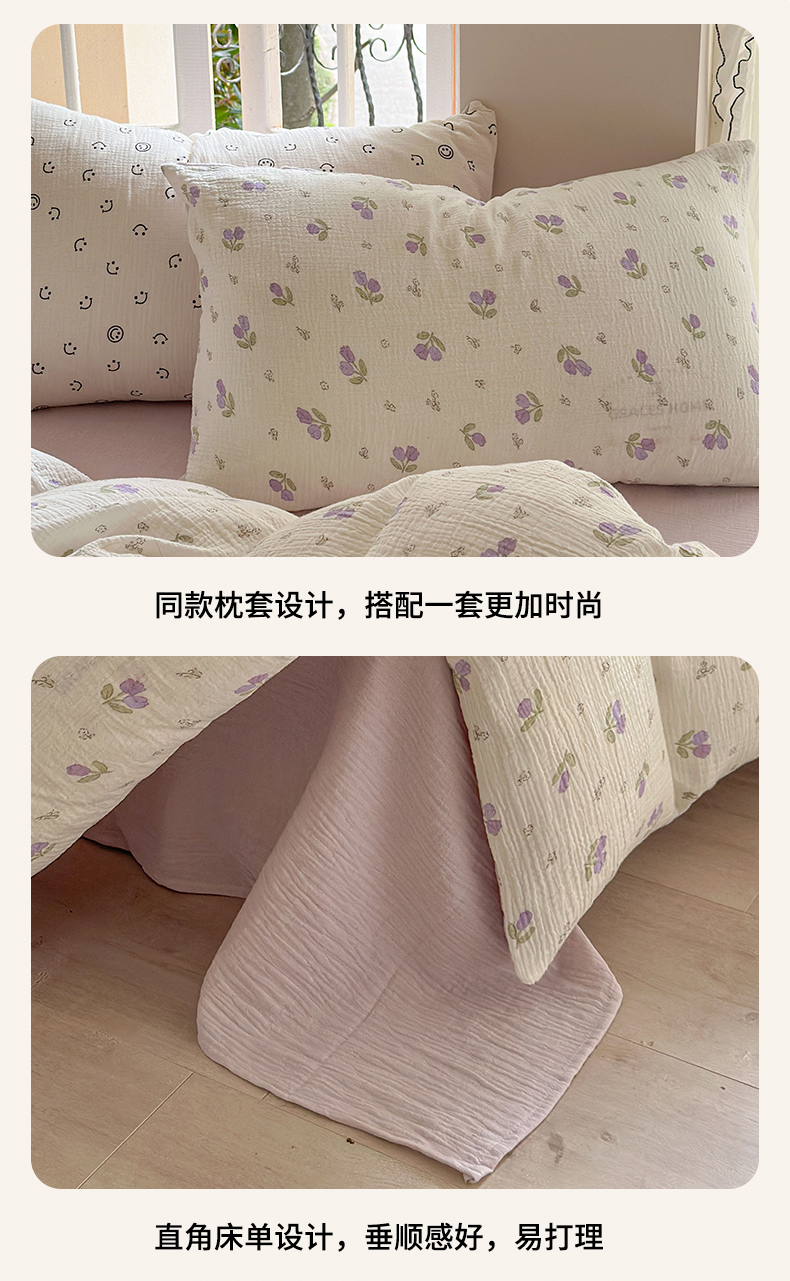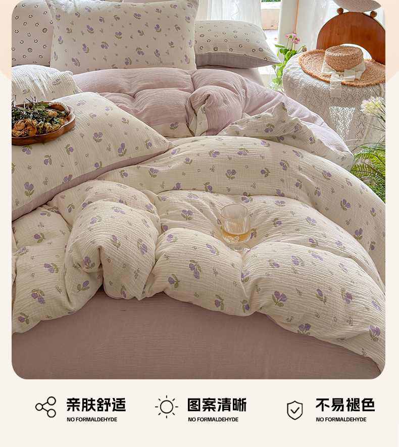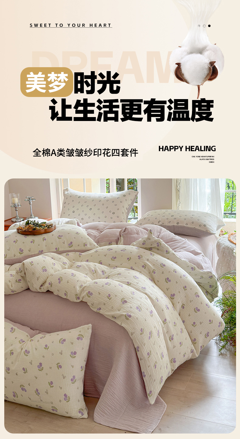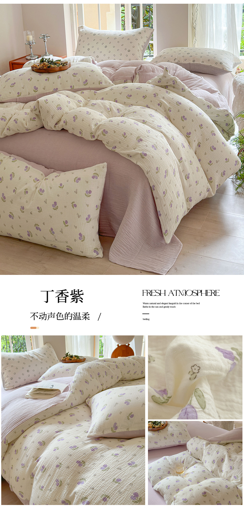 商品名称:木楌 2025新款全棉A类皱皱纱印花四件套 丁香-紫