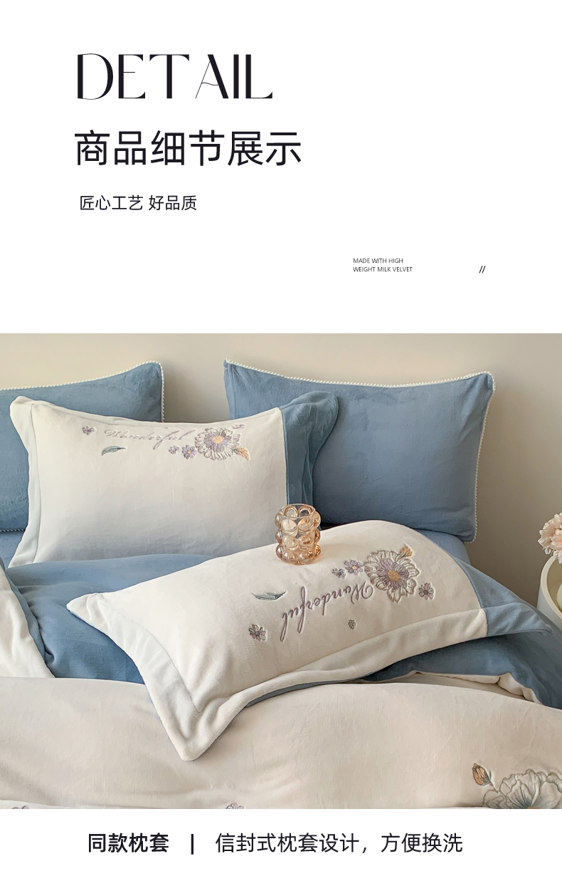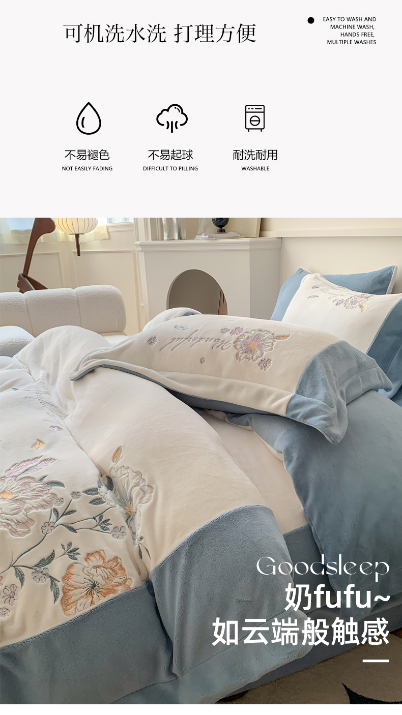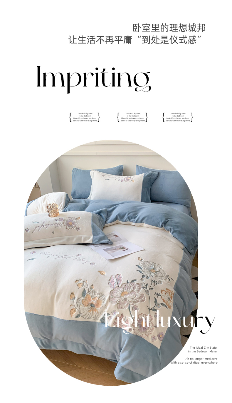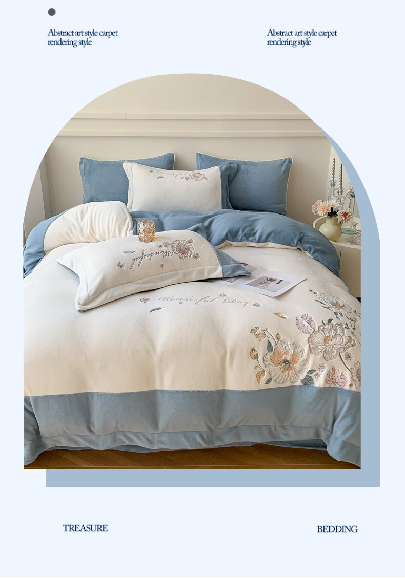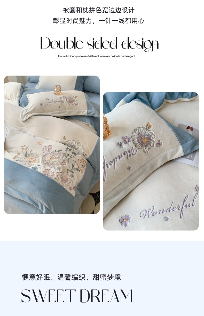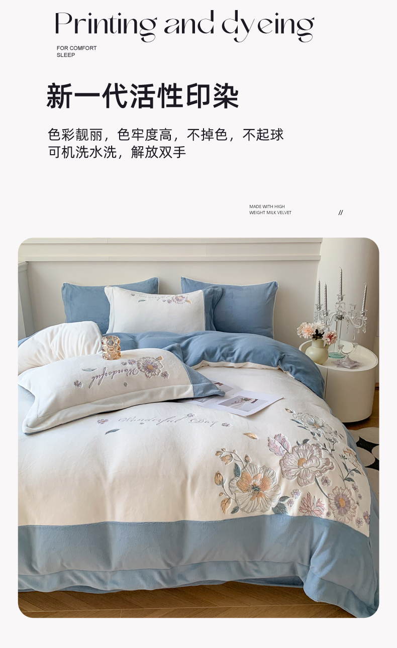 艾唯希家纺 2024高端臻棉绒工艺四件套高克重牛奶绒珊瑚绒宝宝绒-缤纷花园系列 缤纷花园-蓝