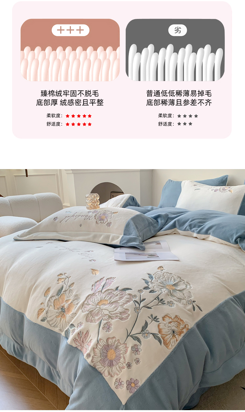 商品名称:艾唯希家纺 2024高端臻棉绒工艺四件套高克重牛奶绒珊瑚绒宝宝绒-缤纷花园系列 缤纷花园-蓝