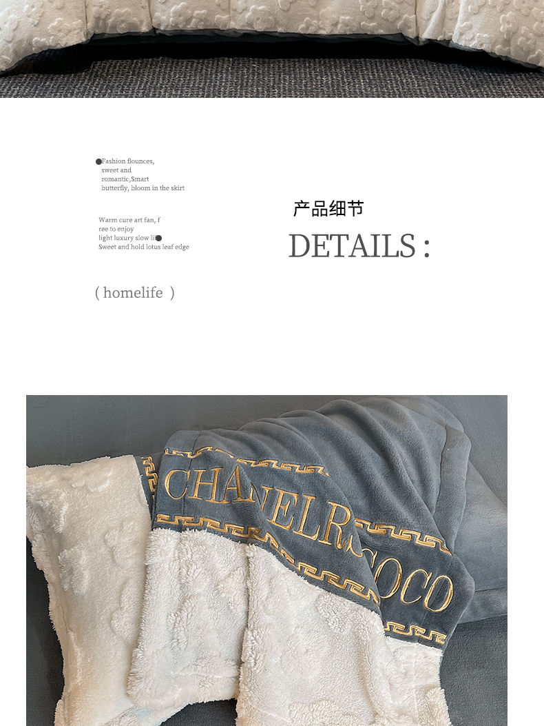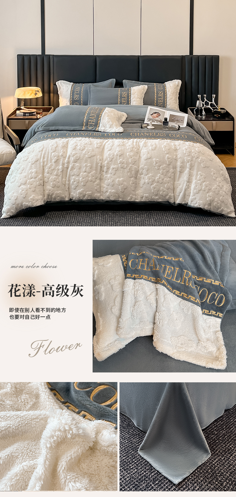商品名称:苏源家居 2024新款牛奶绒轻奢风拼接花漾系列四件套 花漾-高级灰
