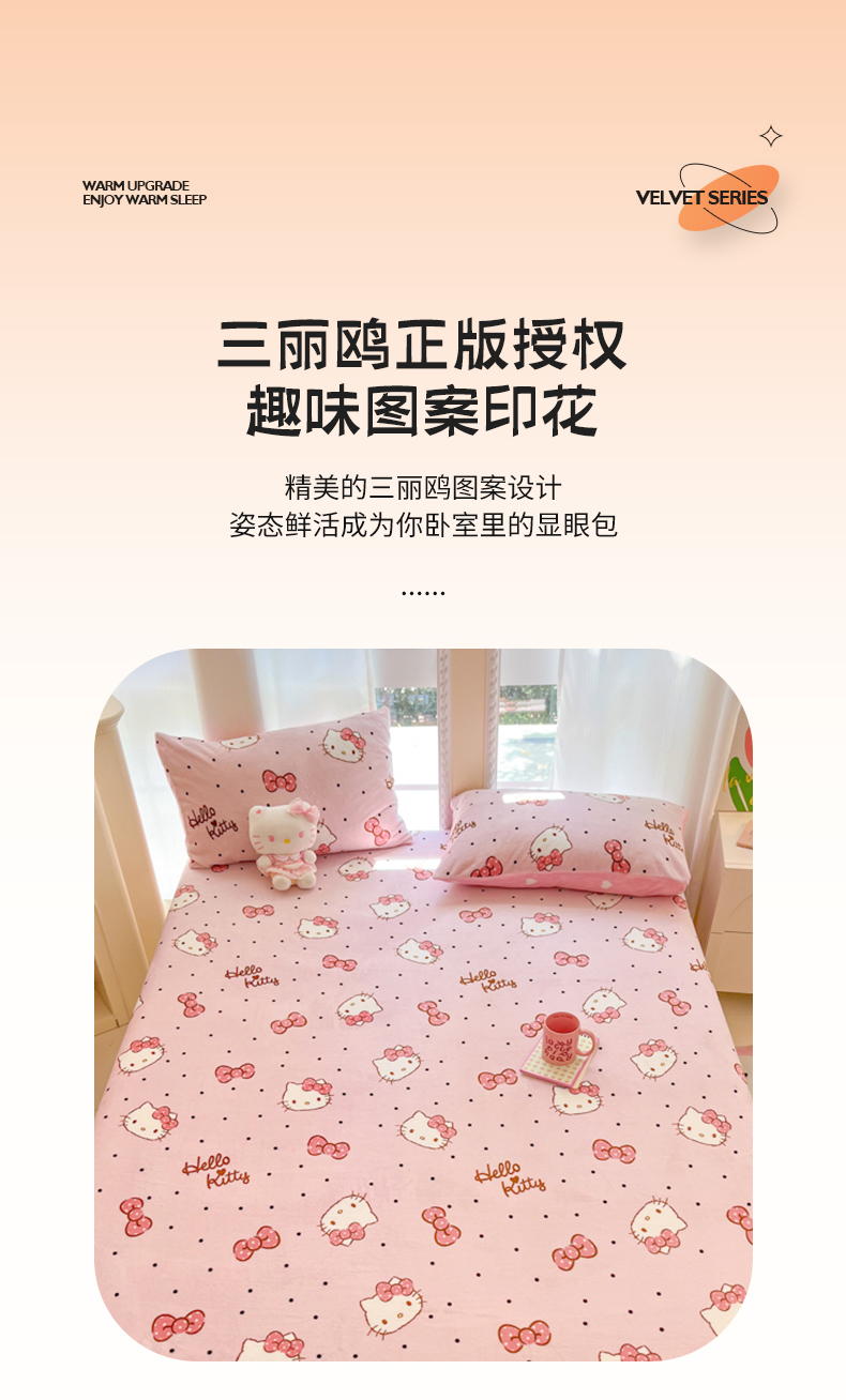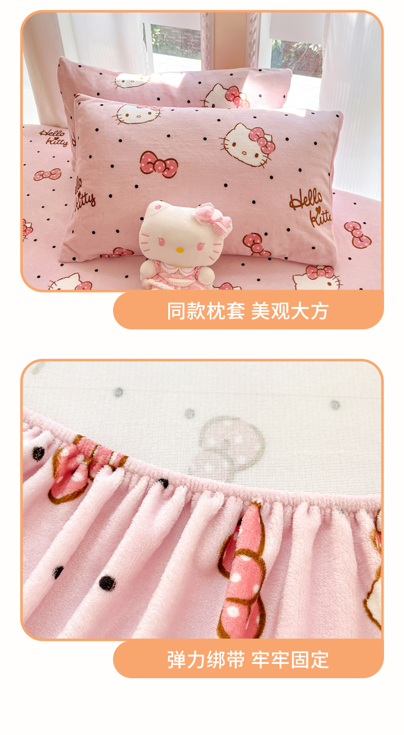 • 91家纺网 家纺一手货源 找家纺 博雅 2024新款三丽鸥牛奶绒小版床笠系列 牛奶绒小版-蝴蝶结KT猫