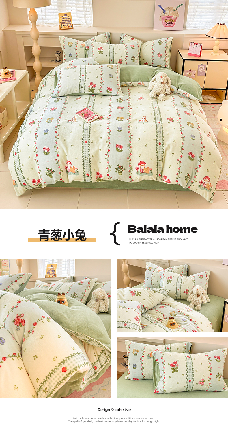 商品名称:沐辰 2024新款高克重牛奶绒印花四件套 青葱小兔