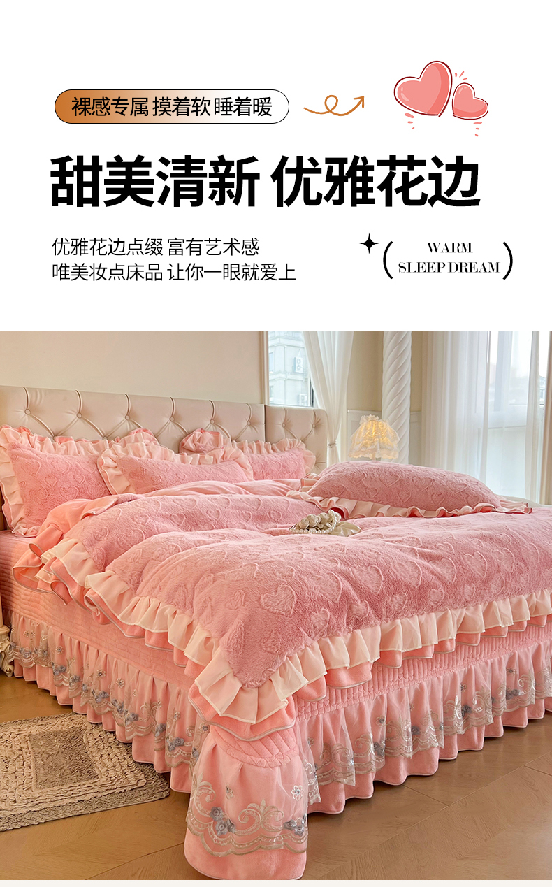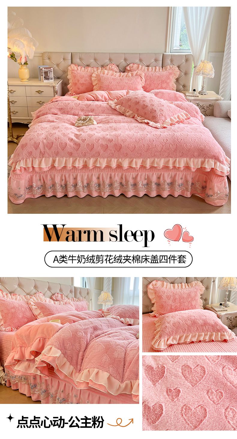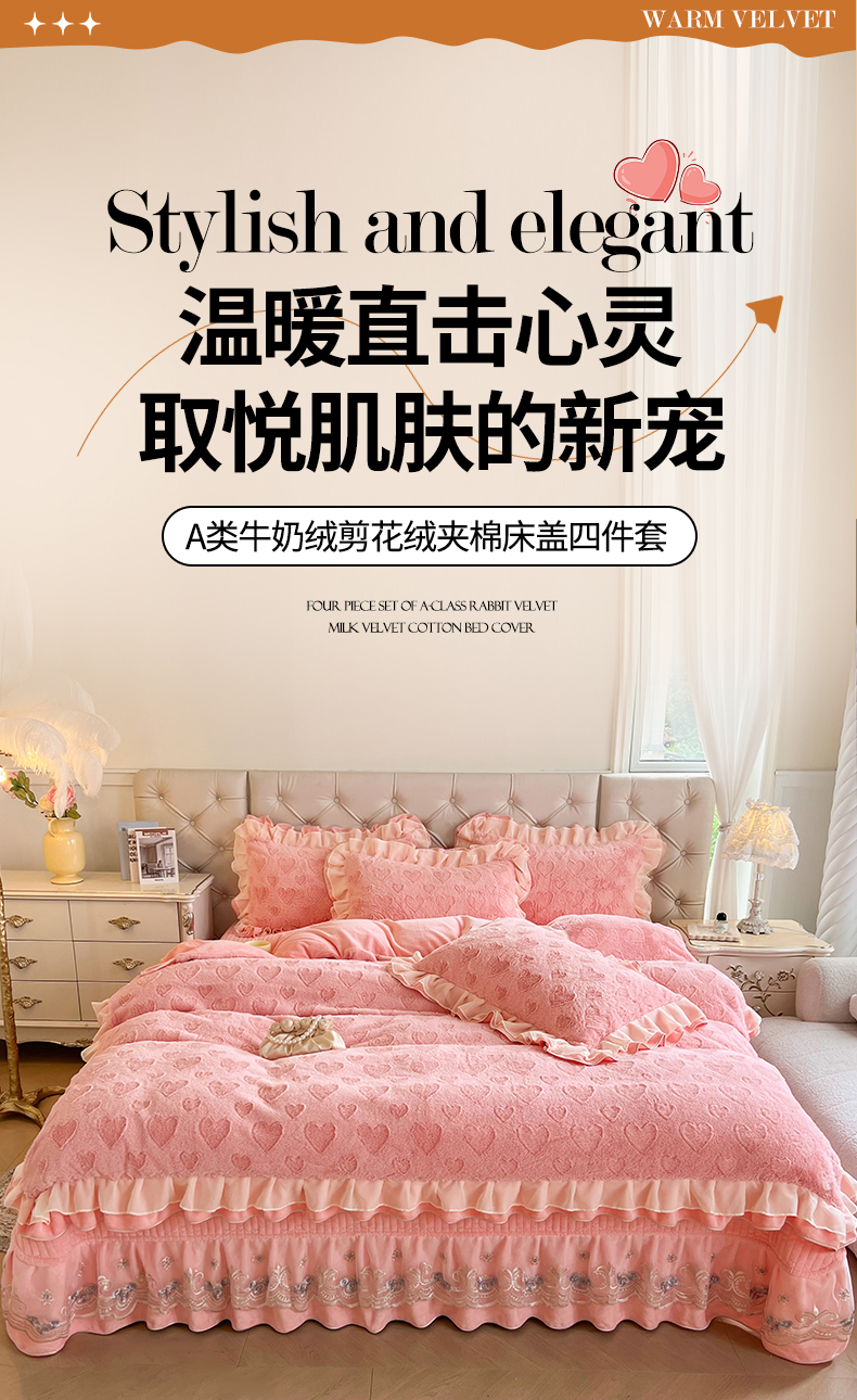 (总)宜凡家纺 2025新款兔绒提花牛奶绒夹棉床裙四件套,爱心 少女粉,爱心 粉紫,爱心 驼色,蝶舞 大红,蝶舞 米色,蝶舞 浅紫,蝶舞 玉色,简爱 苍青,简爱 豆沙紫,简爱 玉色,樱桃 苍青,樱桃 豆沙紫,樱桃 奶油白