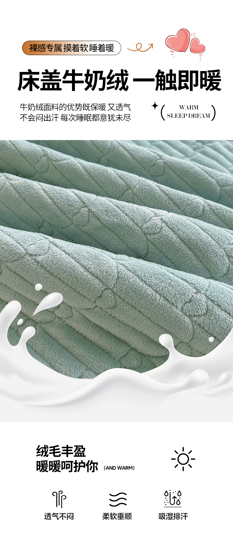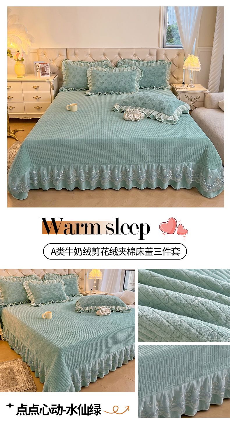 商品名称:宜凡家纺 2024新款A类牛奶绒剪花绒床盖三件套 点点心动-水仙绿
