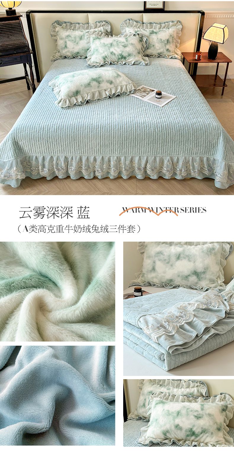 商品名称:宜凡家纺 2024新款高克重牛奶绒兔绒床盖三件套 云雾深深 绿