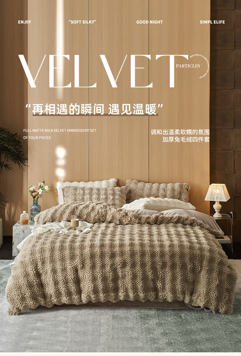 商品名称:安哆啦家纺 2024新款高克重10斤轻奢托斯卡纳兔毛绒喷花泡泡牛奶绒四件套 喷花-卡其