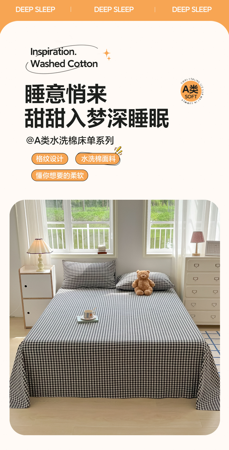 韩巢家纺 2025新款格子纯色A类水洗棉床单单件 A类黑色格-床单