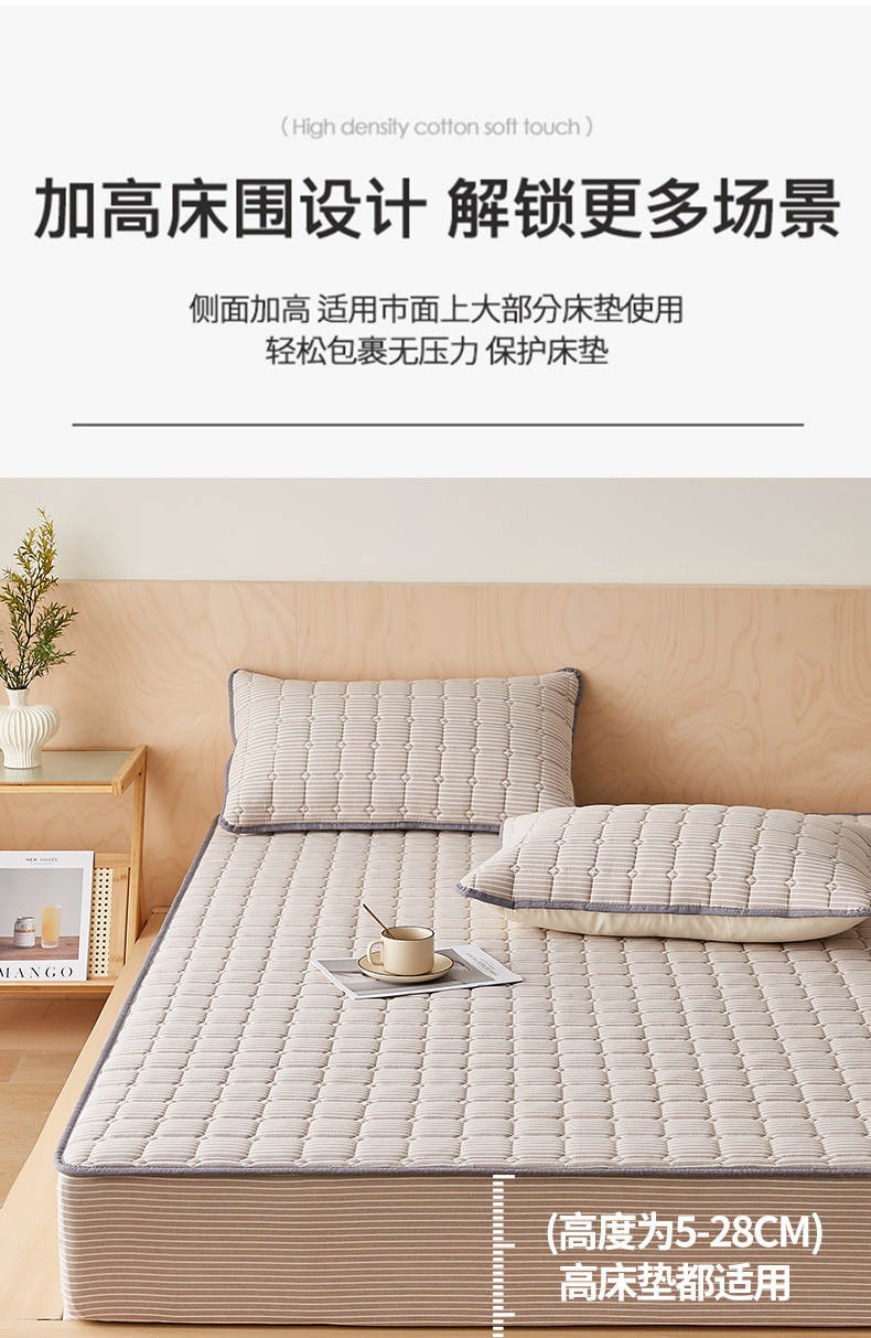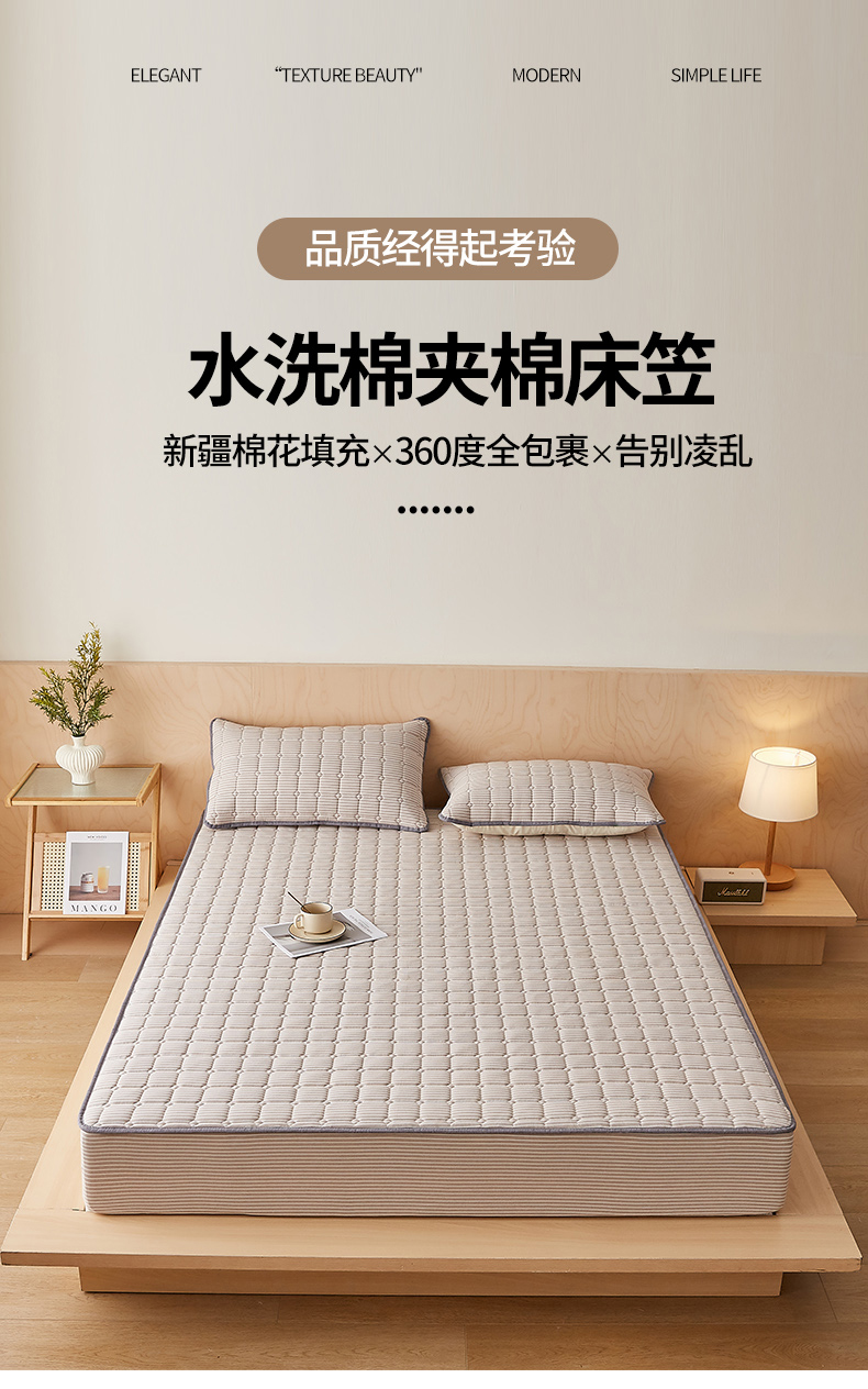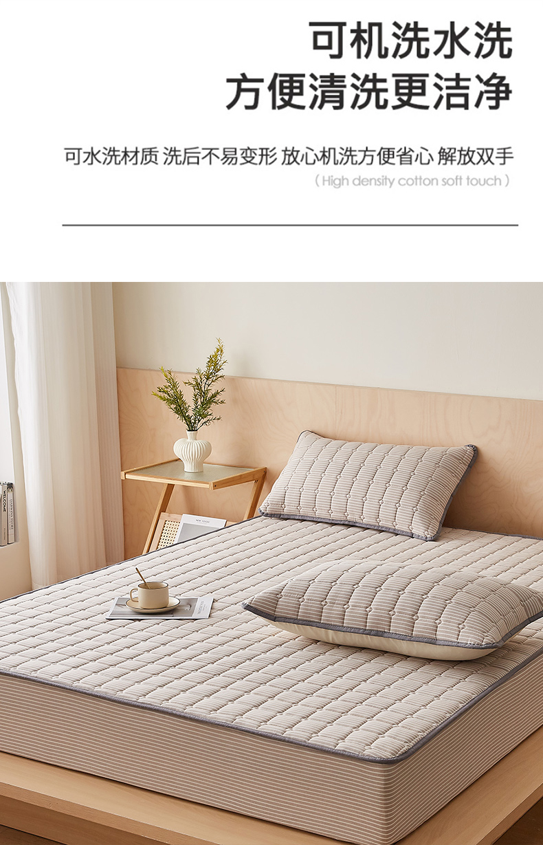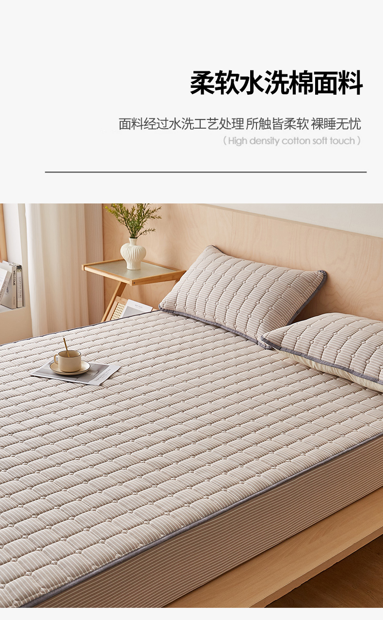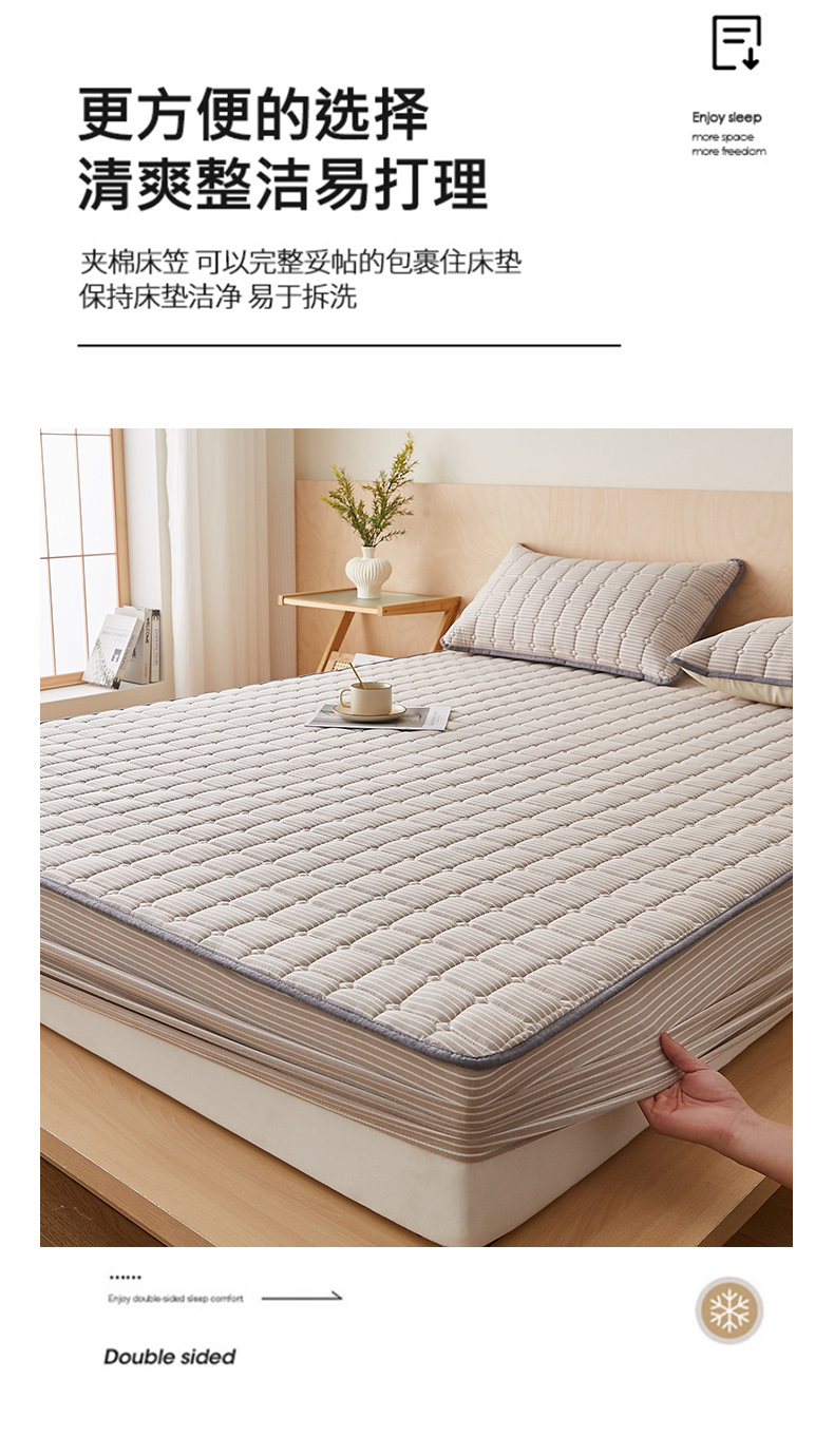 • 91家纺网 家纺一手货源 找家纺 暖季家纺 2025新款水洗棉夹棉床笠无印风棉花款 棉花床笠咖细条