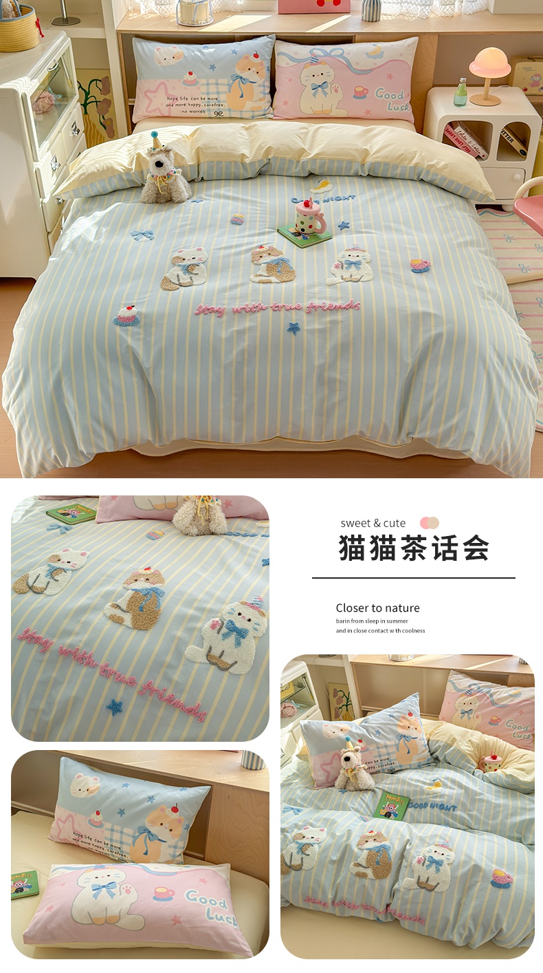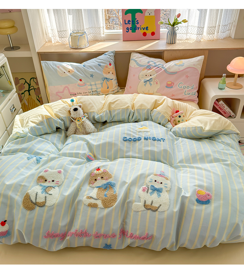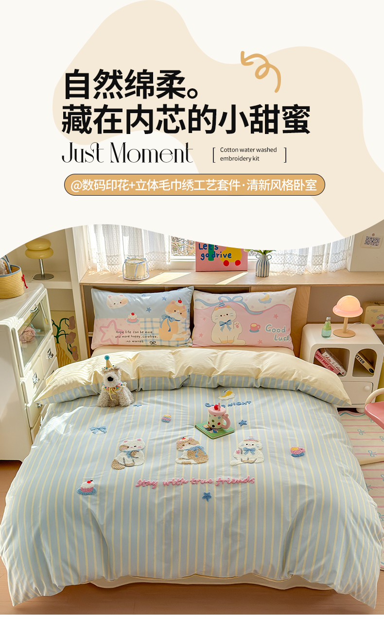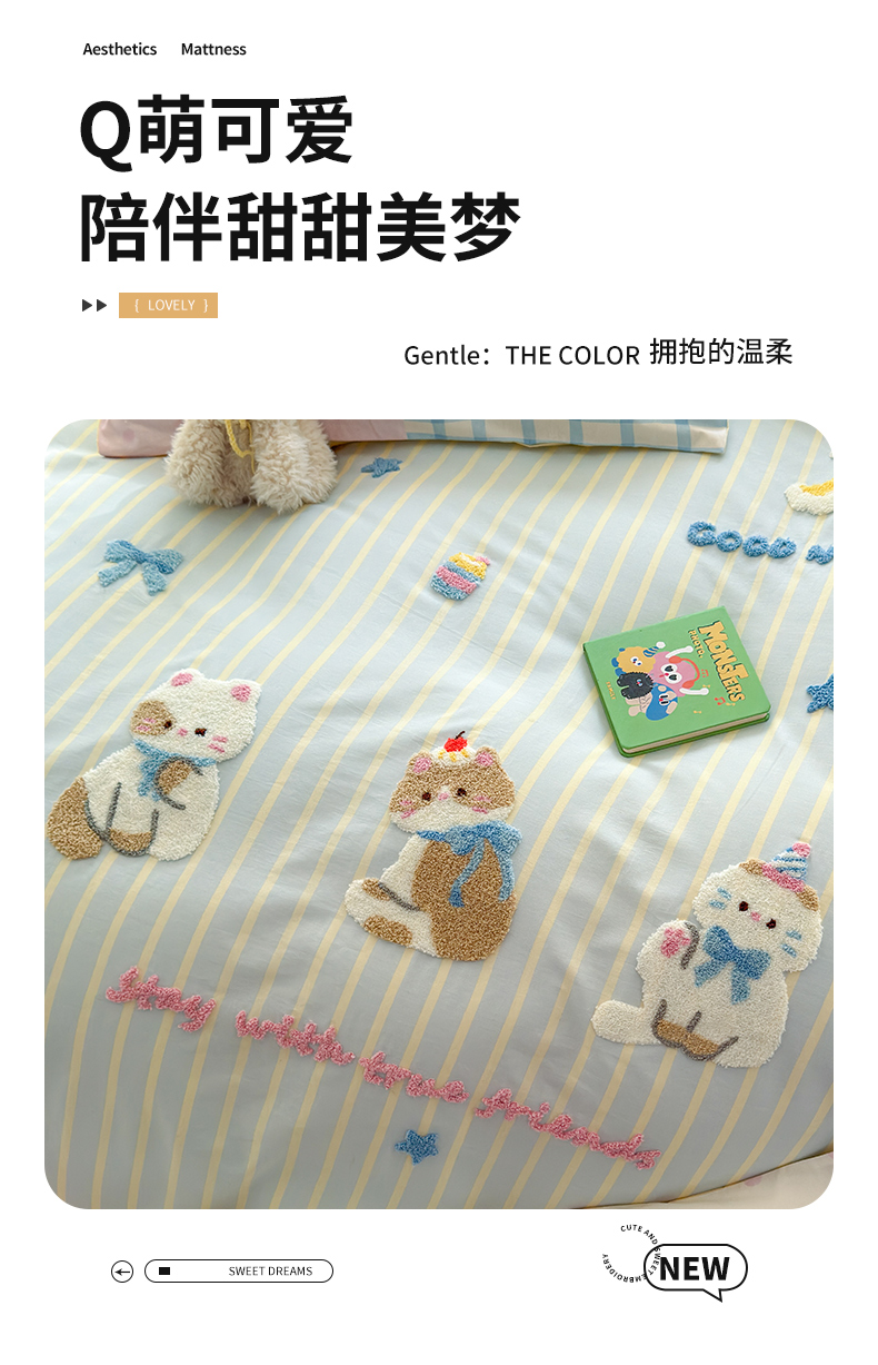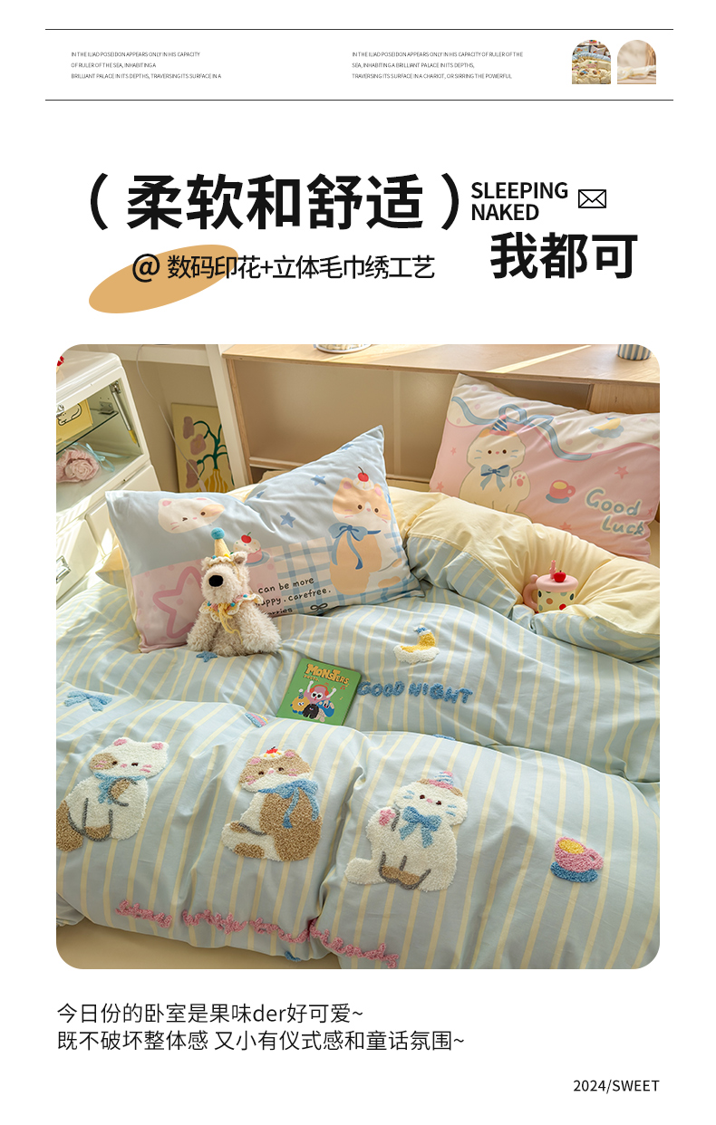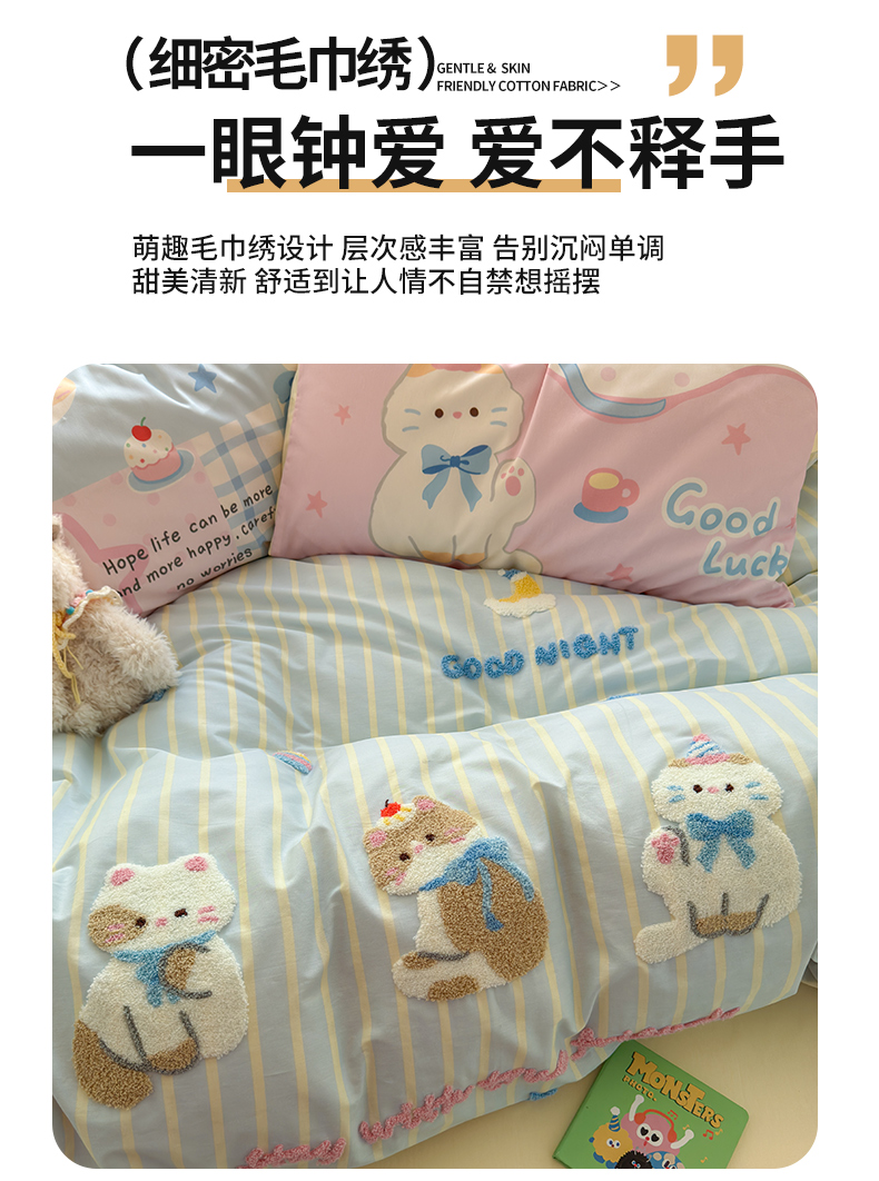 (总)优彩 2025新款牛奶绒绣花四件套毛巾绣贴布绣牛奶绒四件套,晚安猫,毛绒森林,萌萌猫,桑尼小兔,水豚崽崽,小可乐,星愿