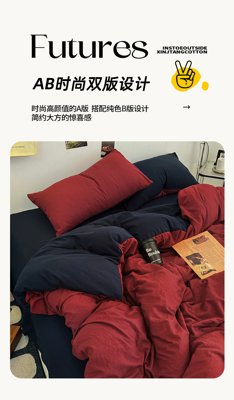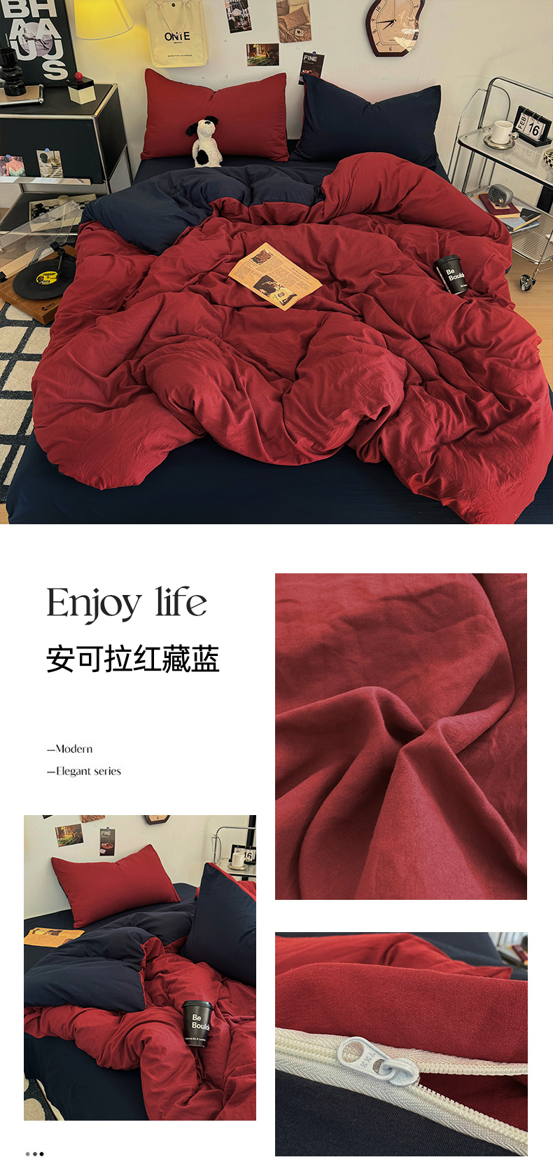 当前位置: 91家纺网 > 商品网购 > 床品套件 > 四件套 > 水洗棉四件套 > 耀达家居 2025新款纯色A类水洗棉双拼四件套 安可拉红藏蓝