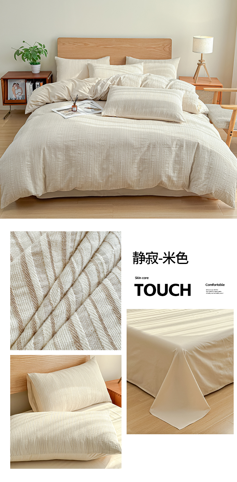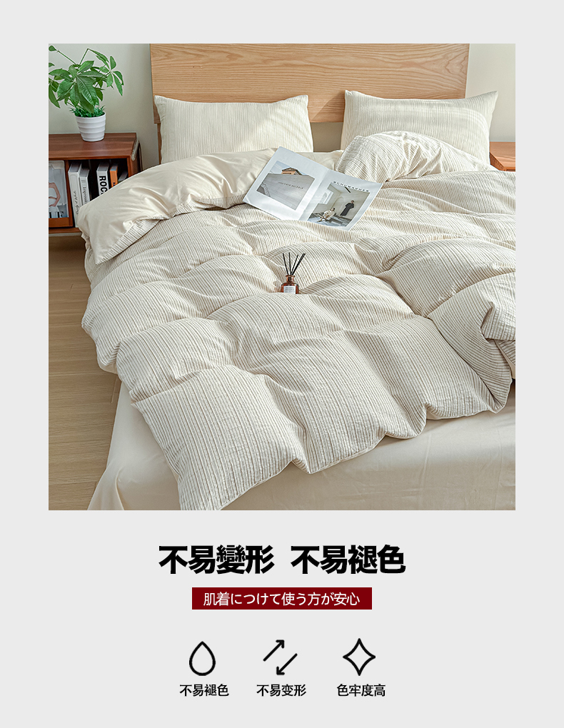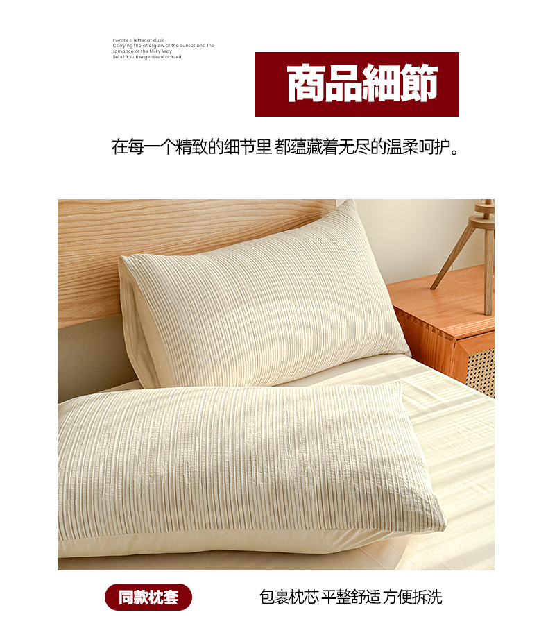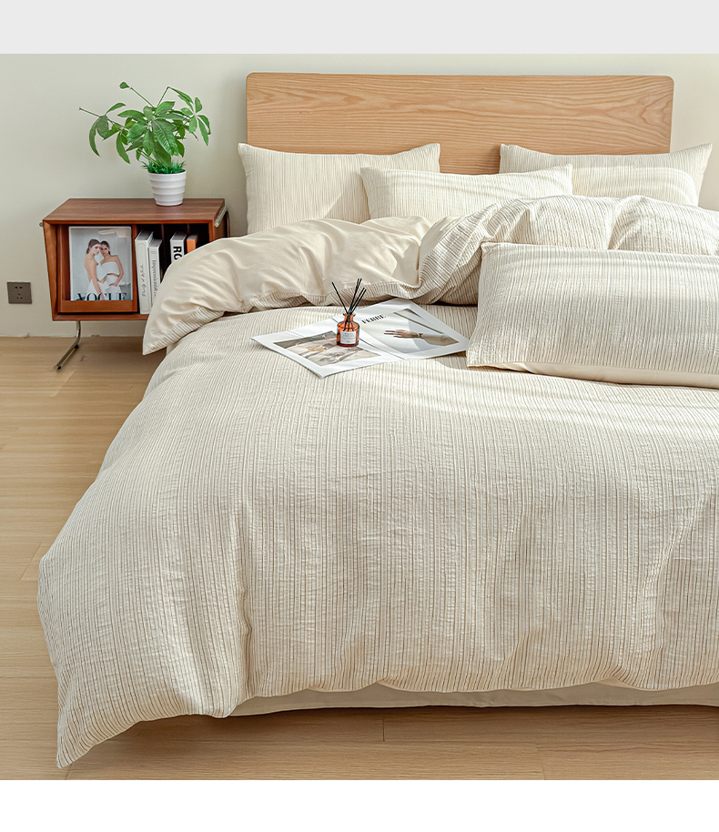 商品名称:莱茵家居 2025春夏新款A类色织皱皱纱全棉四件套 静寂-米色