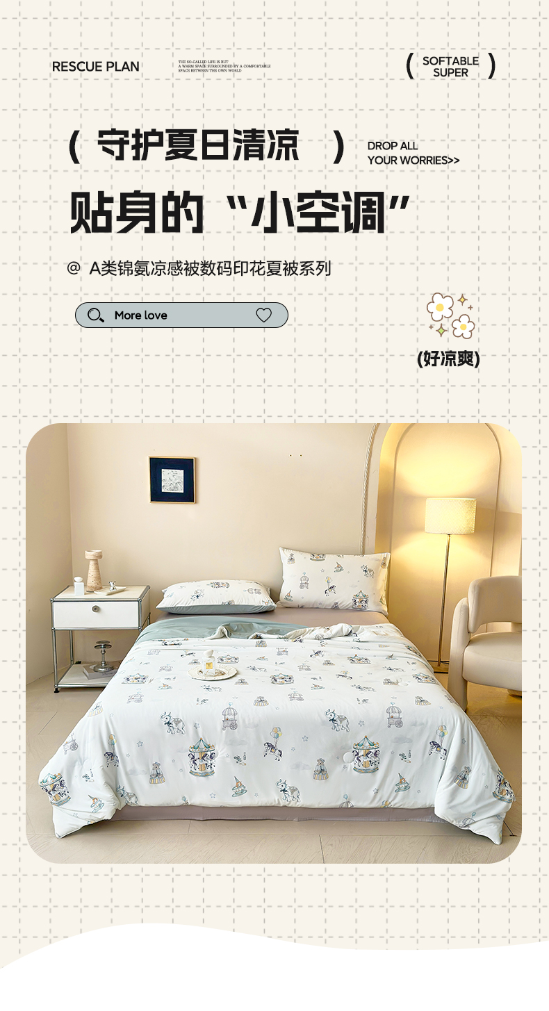 商品名称:莱登卡奴 2025新款A类锦氨凉感被数码印花夏被 童年乐园芥末绿