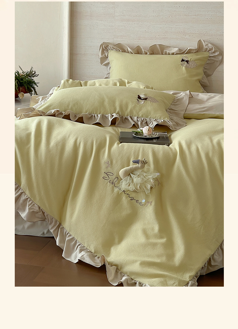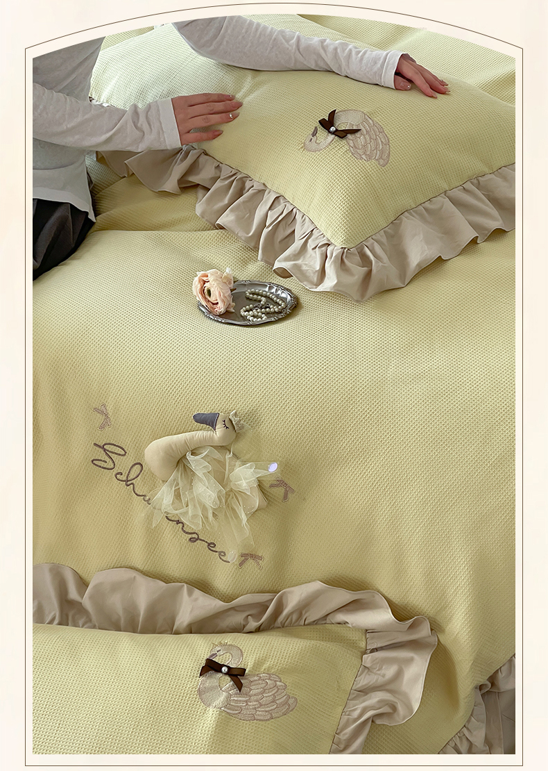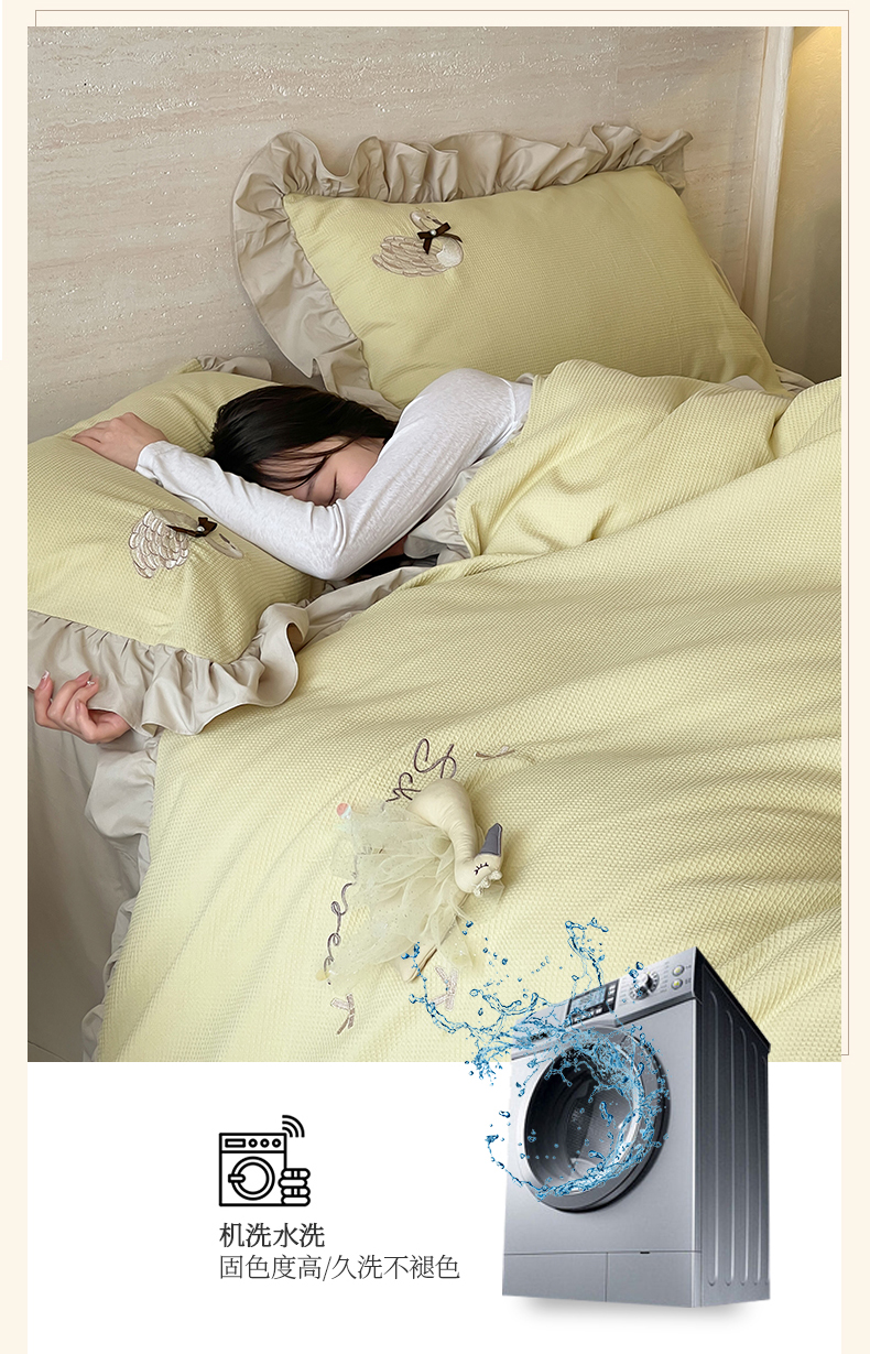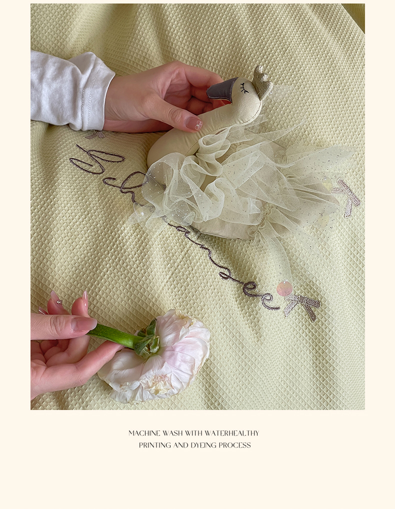 名品优仓 2025新款全棉华夫格水洗棉双层纱手工花提花韩版花边四件套 天鹅舞曲-夜绿
