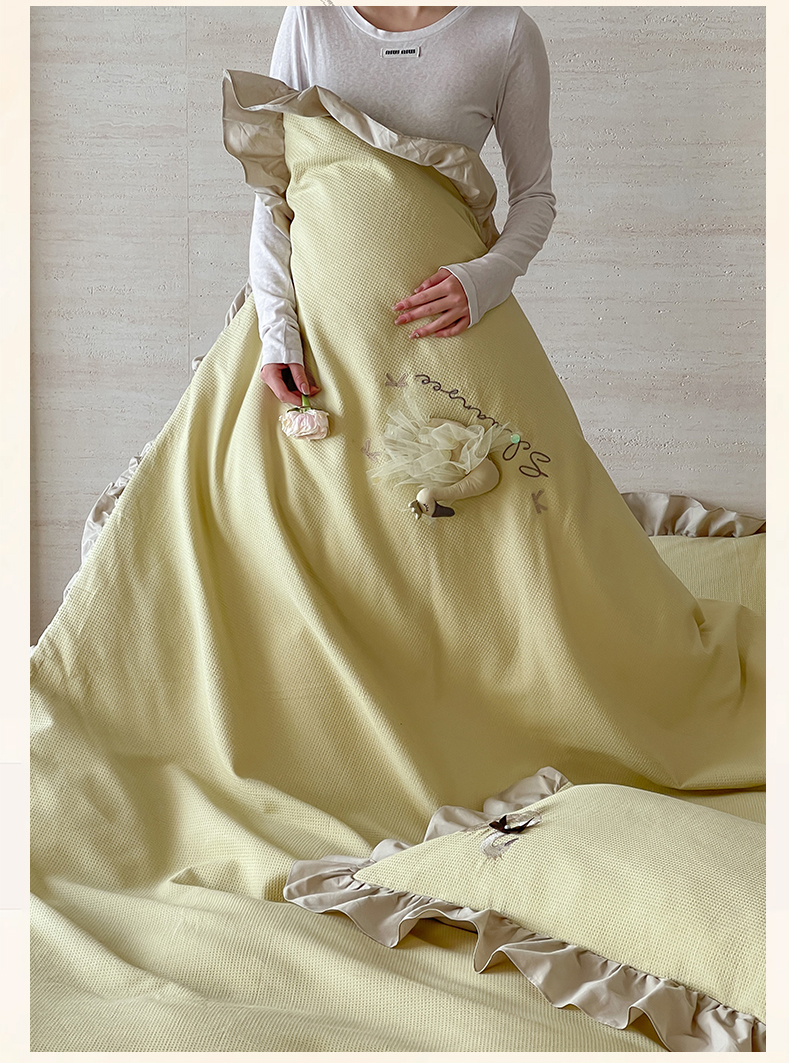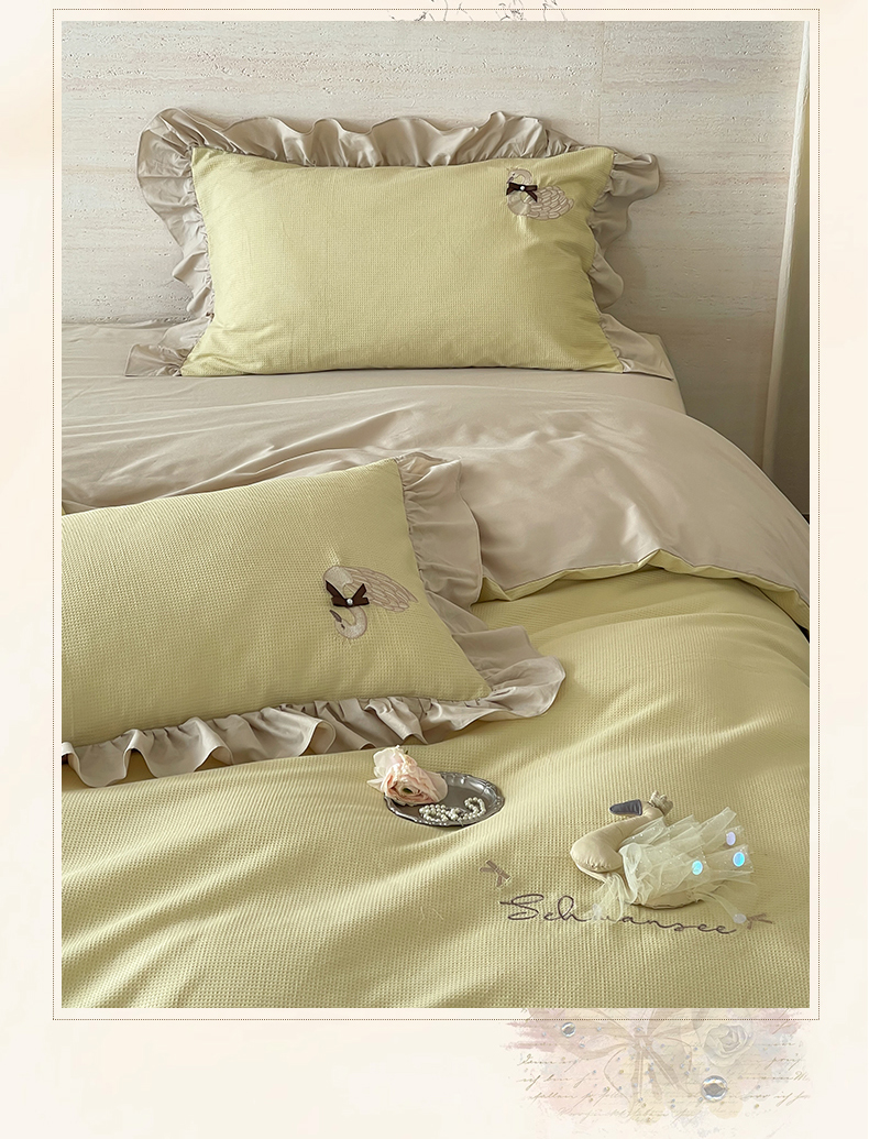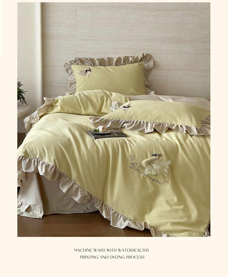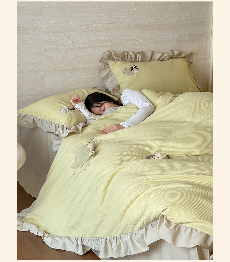 名品优仓 2025新款全棉华夫格水洗棉双层纱手工花提花韩版花边四件套 天鹅舞曲-夜绿