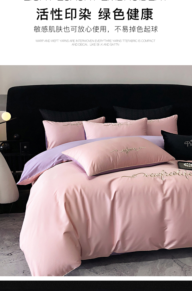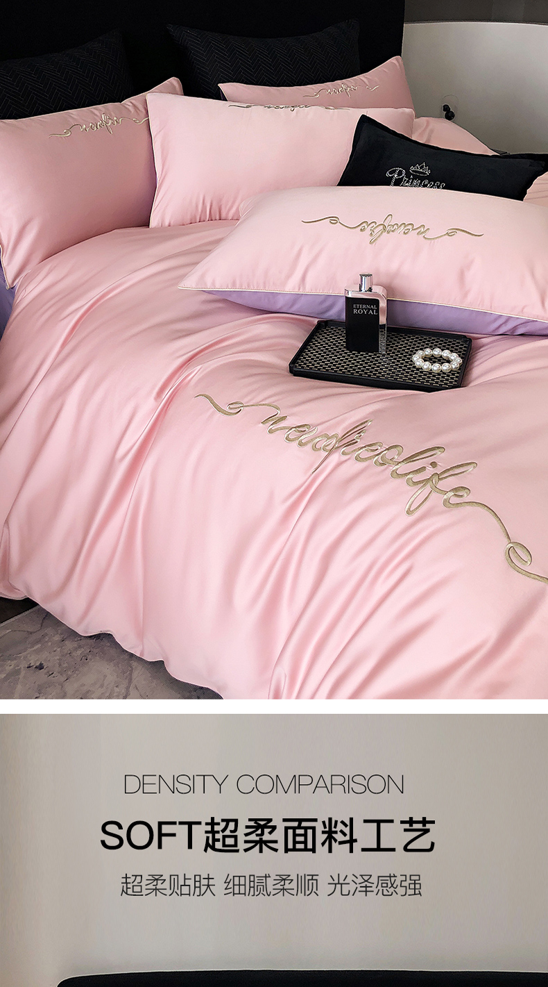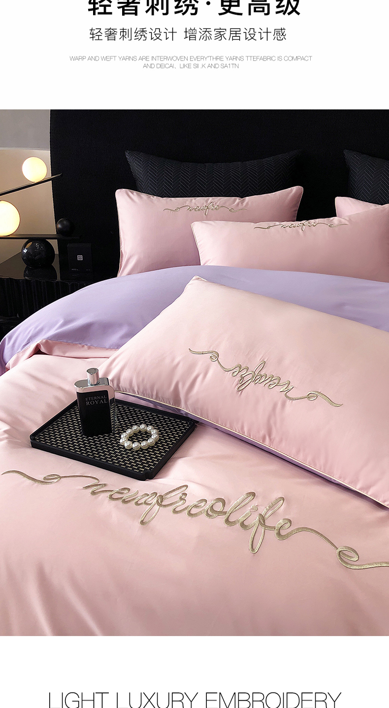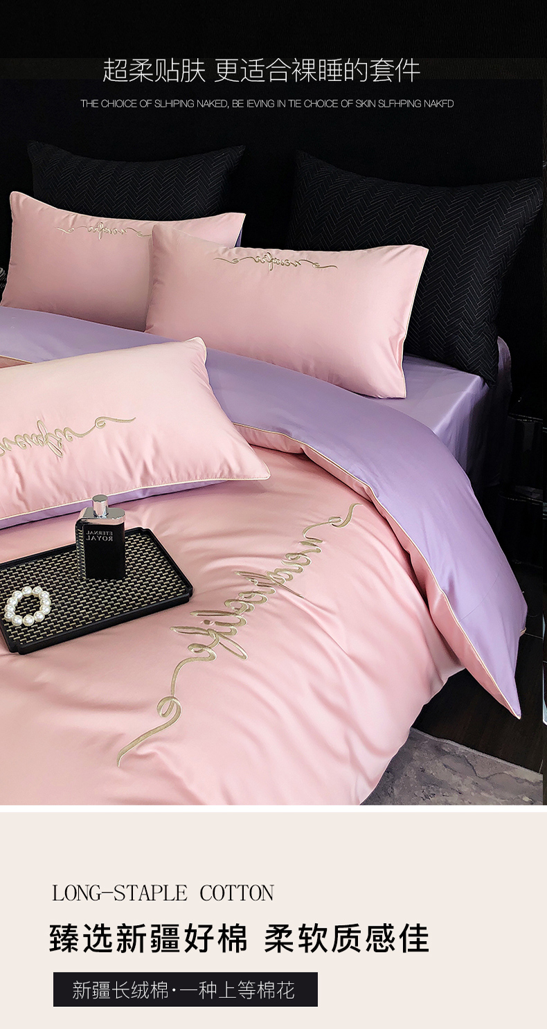 商品名称:禧澜庭 2025新款高支纯棉全棉斜纹四件套刺绣绣花款轻奢三件套--卡罗系列 戴妃粉+魅紫