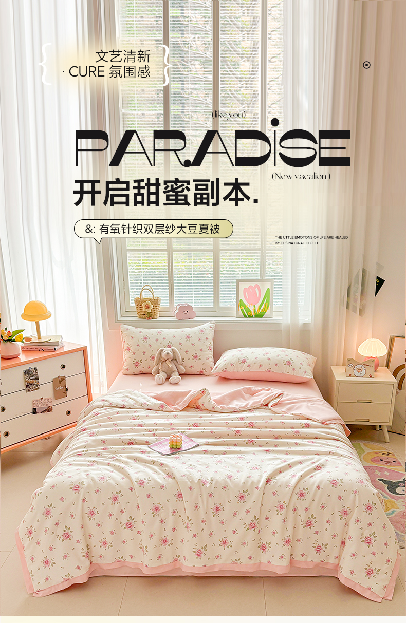 • 91家纺网 家纺一手货源 找家纺 (总)典冠 2025新款全棉印花夏凉被夏被四件套,爱心木马,极简主义,洛琳粉,美好时光,甜美蝴蝶结,兔子乐园,叶曲,醉花语,组合
