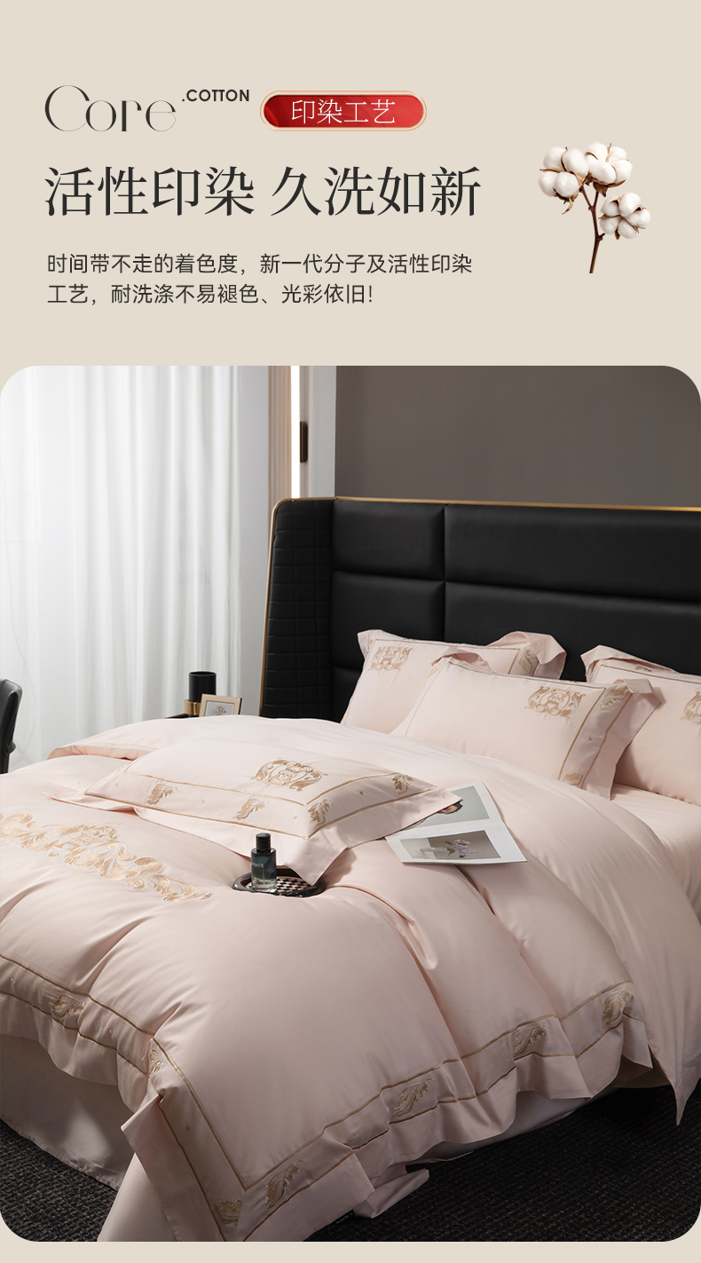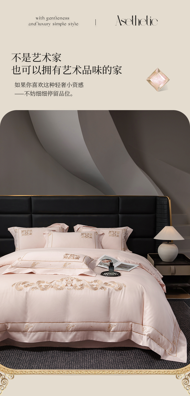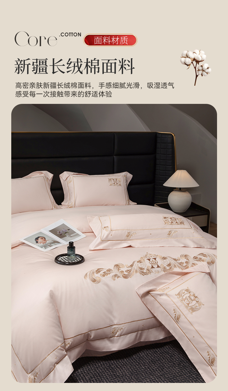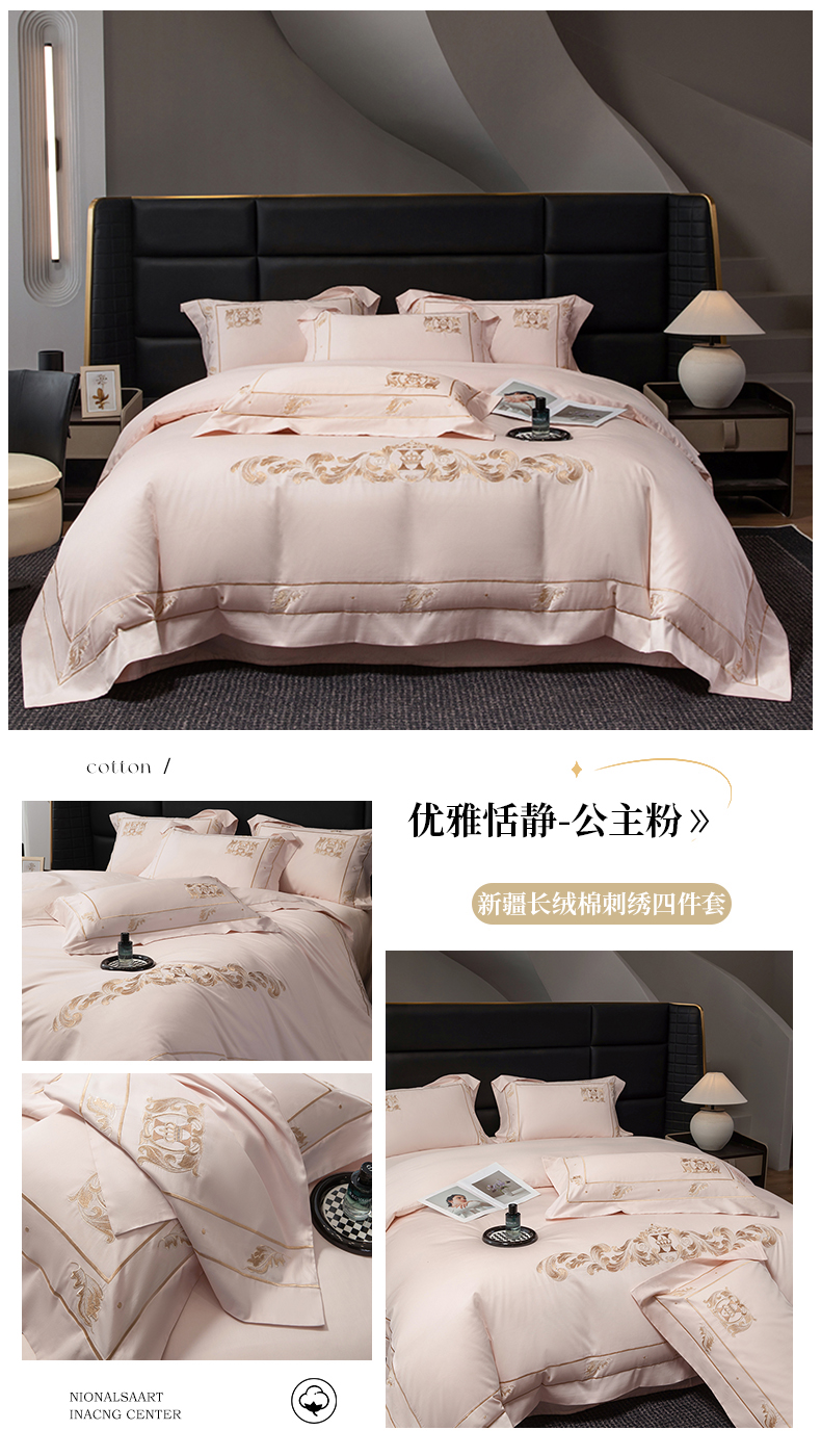 商品名称:家居1号家纺 2025新款新疆长绒棉宽边刺绣四件套-优雅恬静 优雅恬静-公主粉