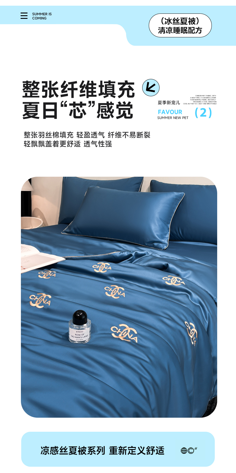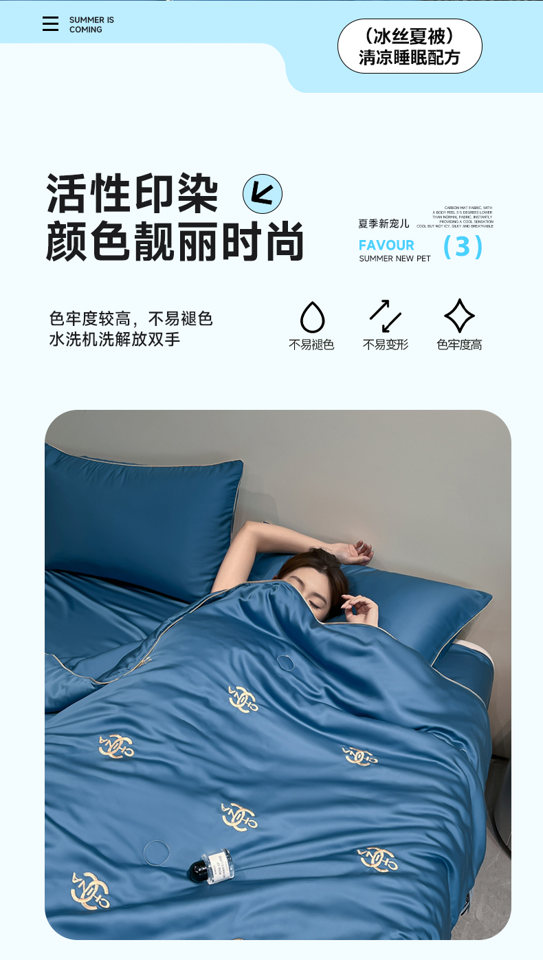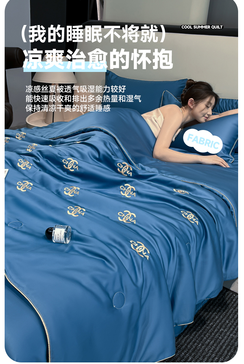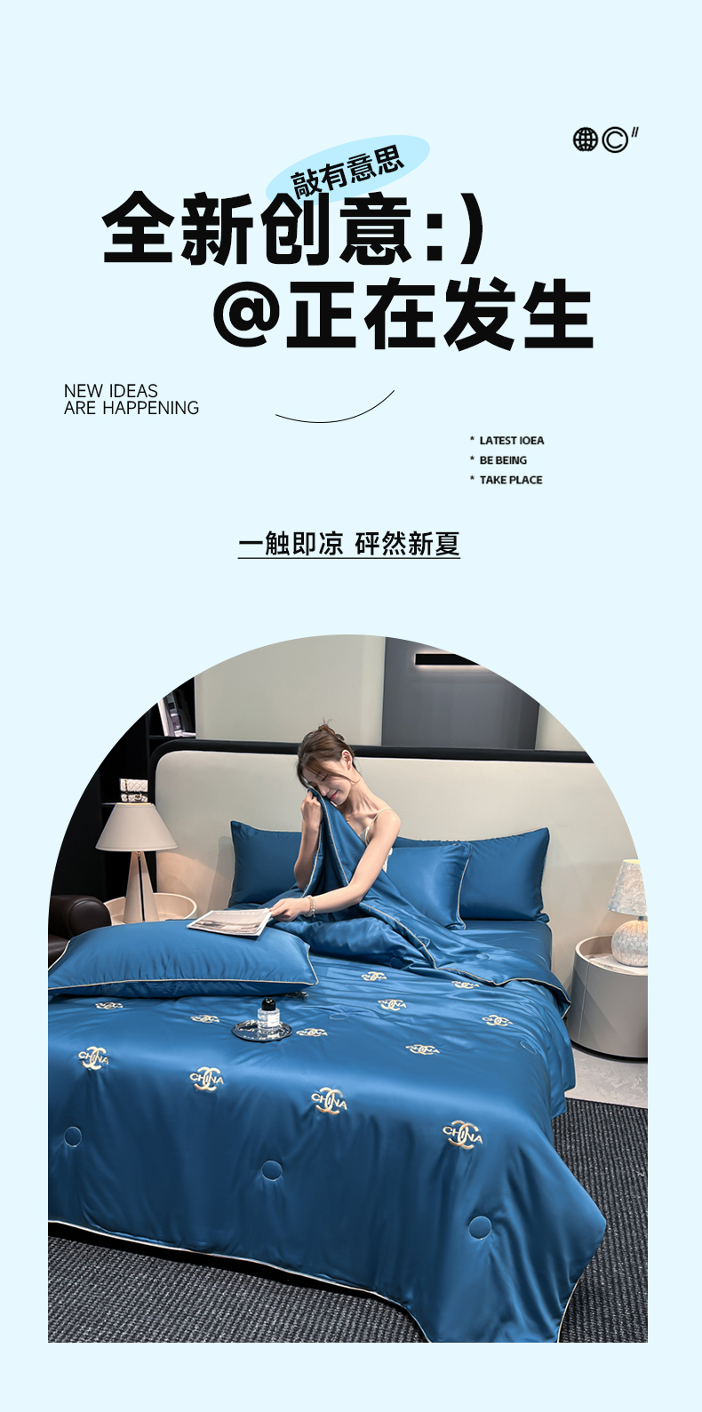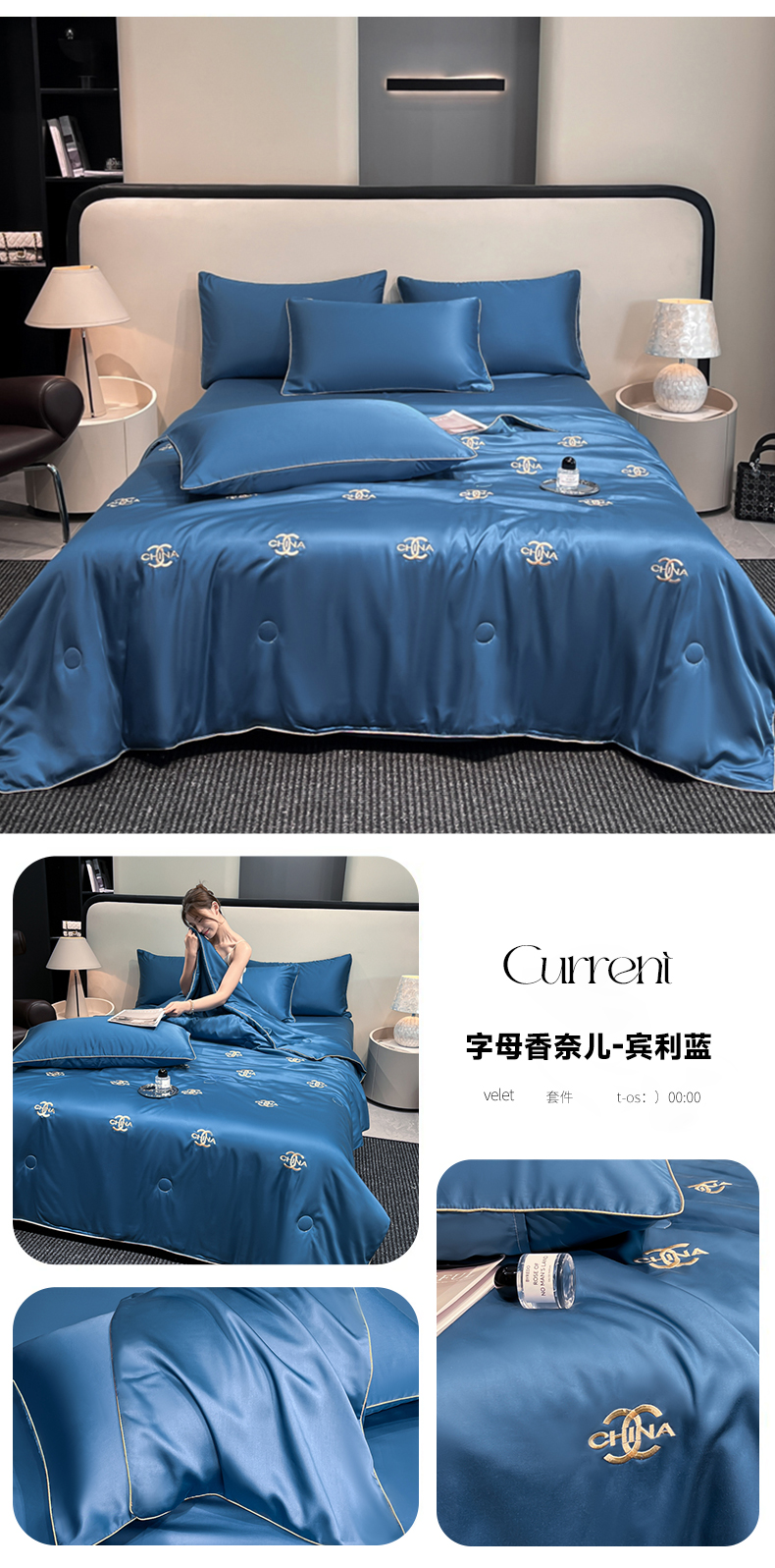 当前位置: 91家纺网 > 商品网购 > 床品套件 > 四件套 > 夏被四件套 > 鑫顺欣 2025新款水洗冰丝刺绣麻绳系列凉感夏被四件套夏凉被 字母香奈儿-宾利蓝