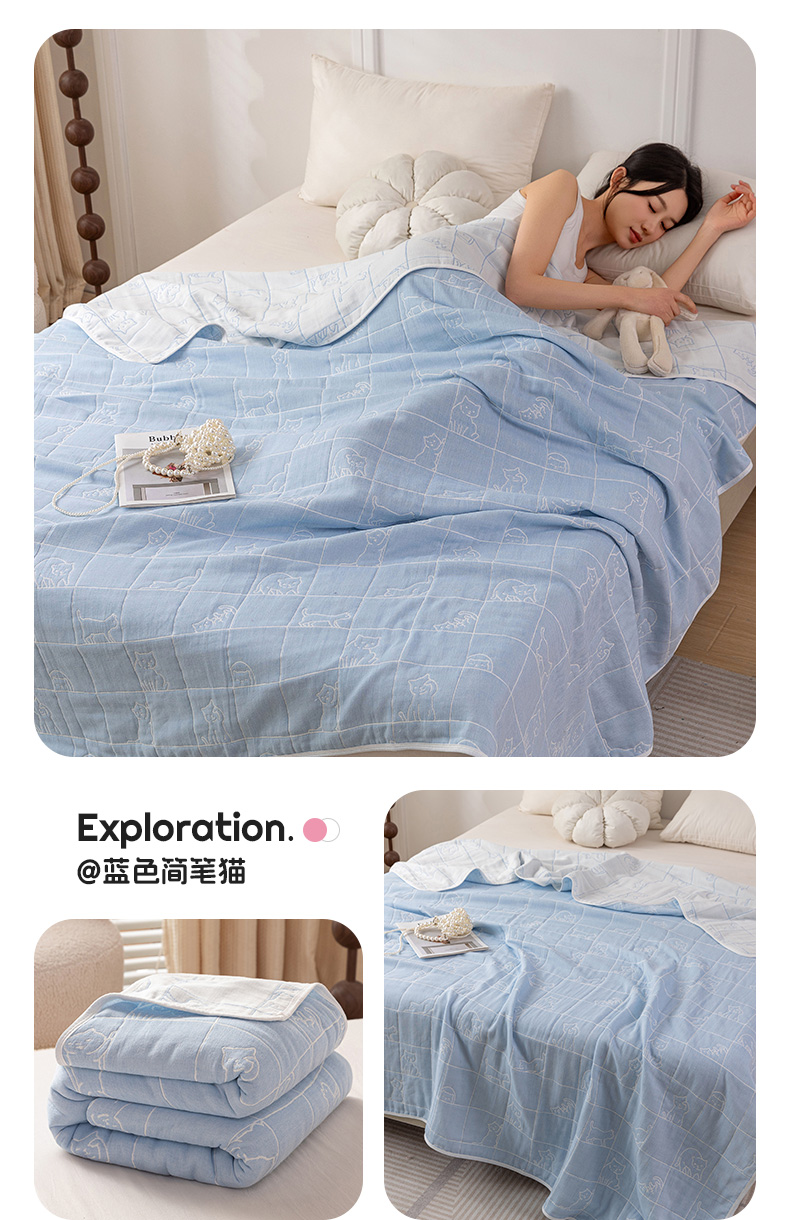 商品名称:乐家毛巾被(工厂自产自销) 2025春夏新款亲肤舒适六层纱布被 蓝色简笔猫