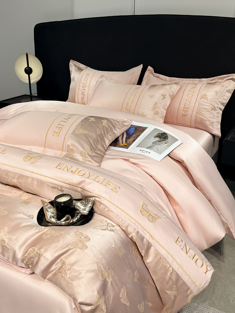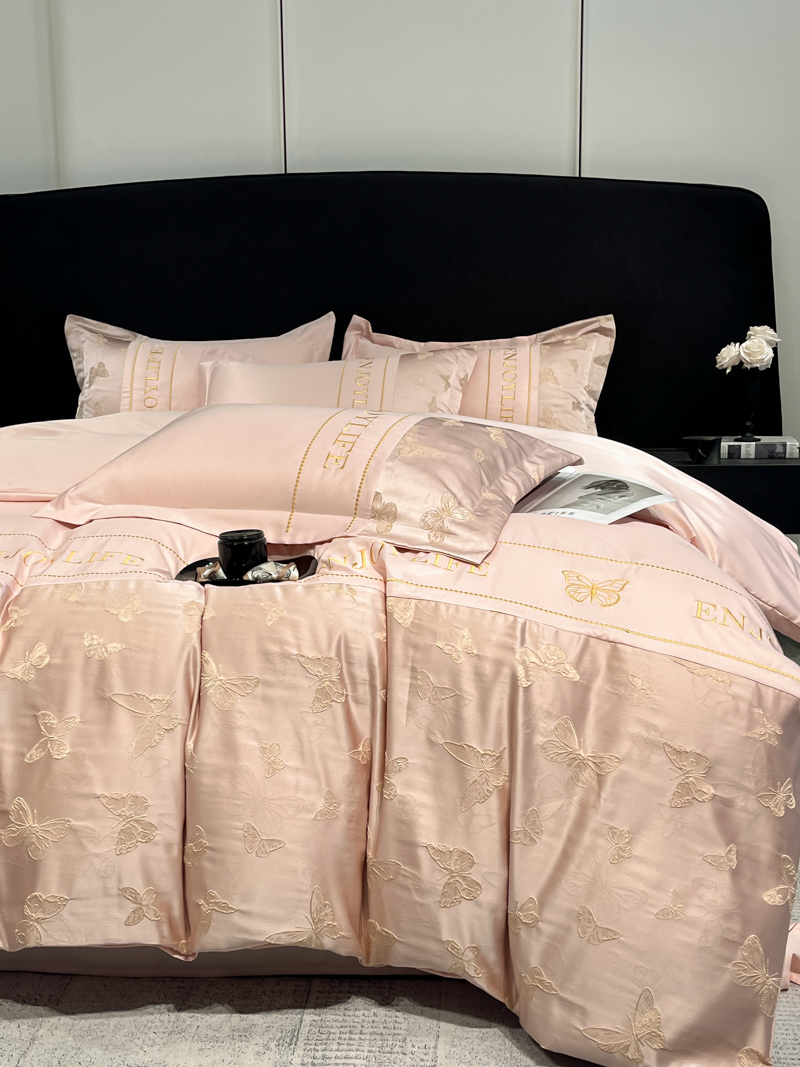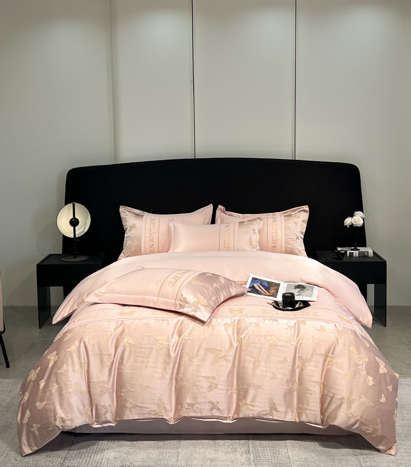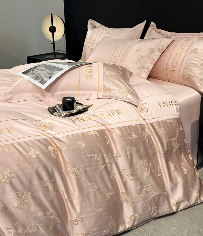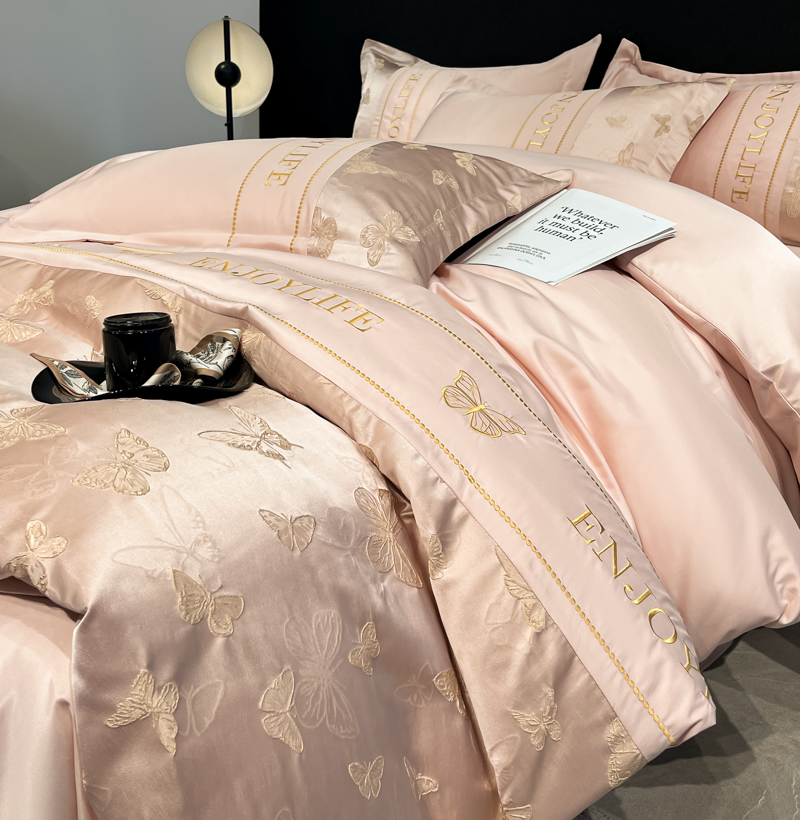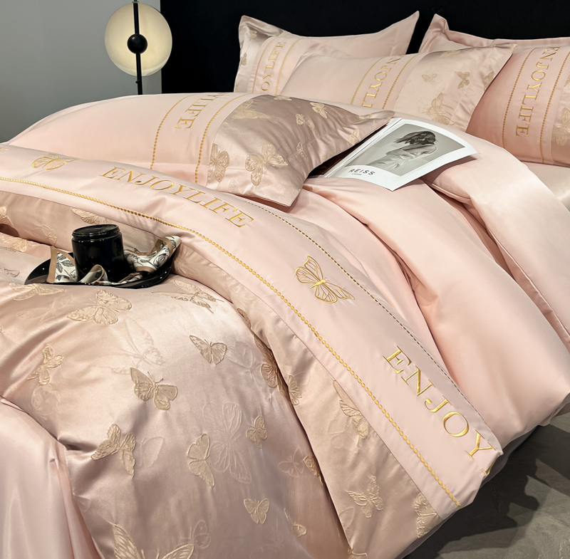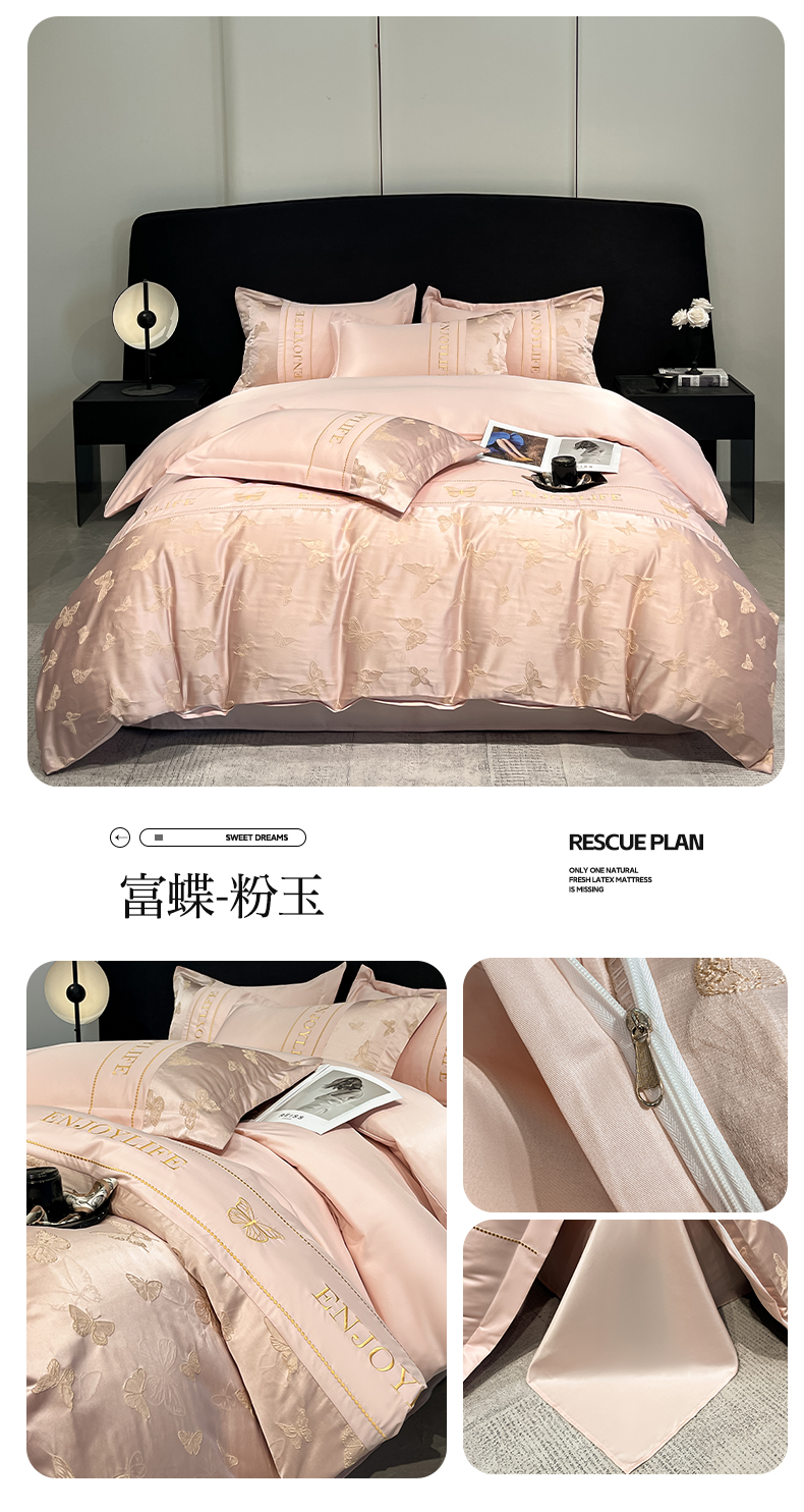 米彩家纺 2025新款A类水洗真丝金丝浮雕提花绣花四件套 富蝶-粉玉