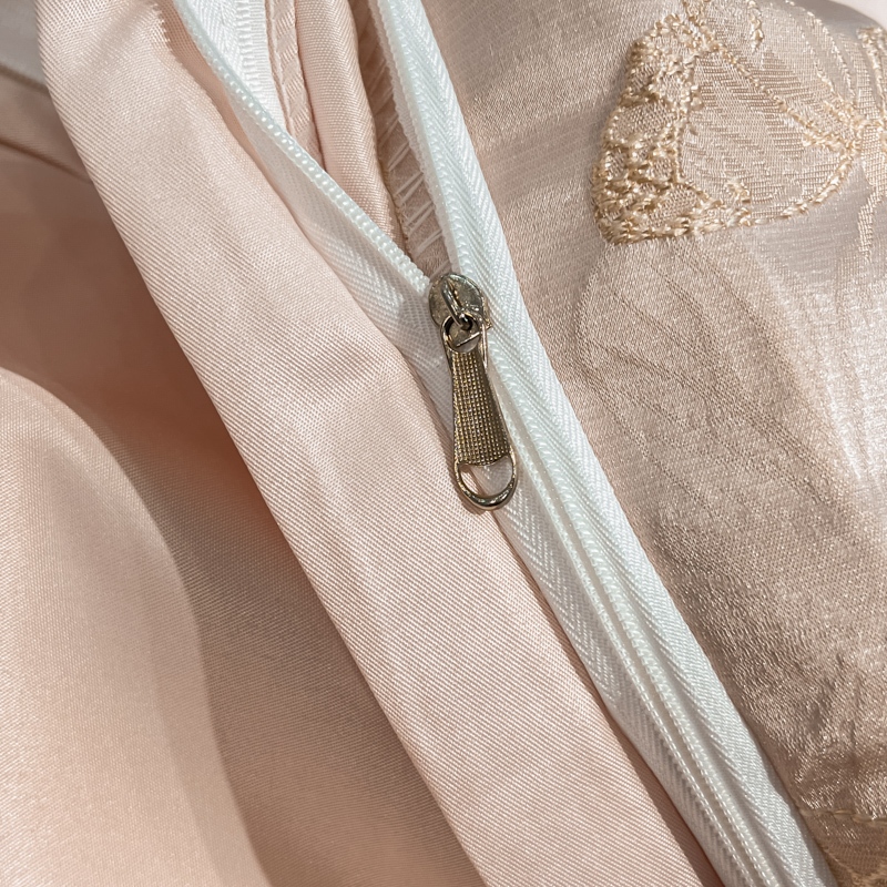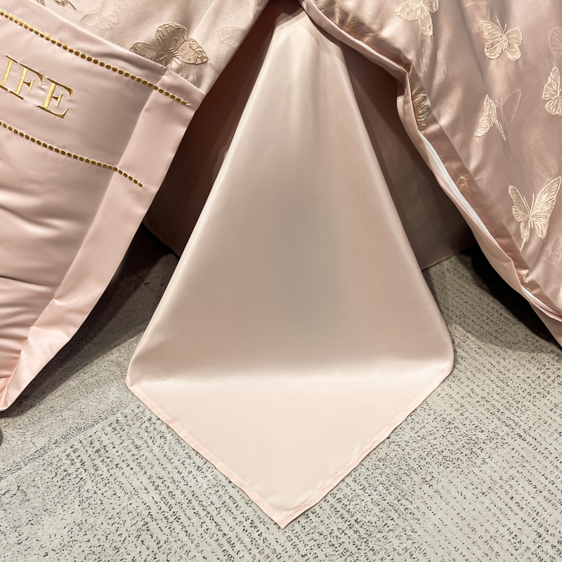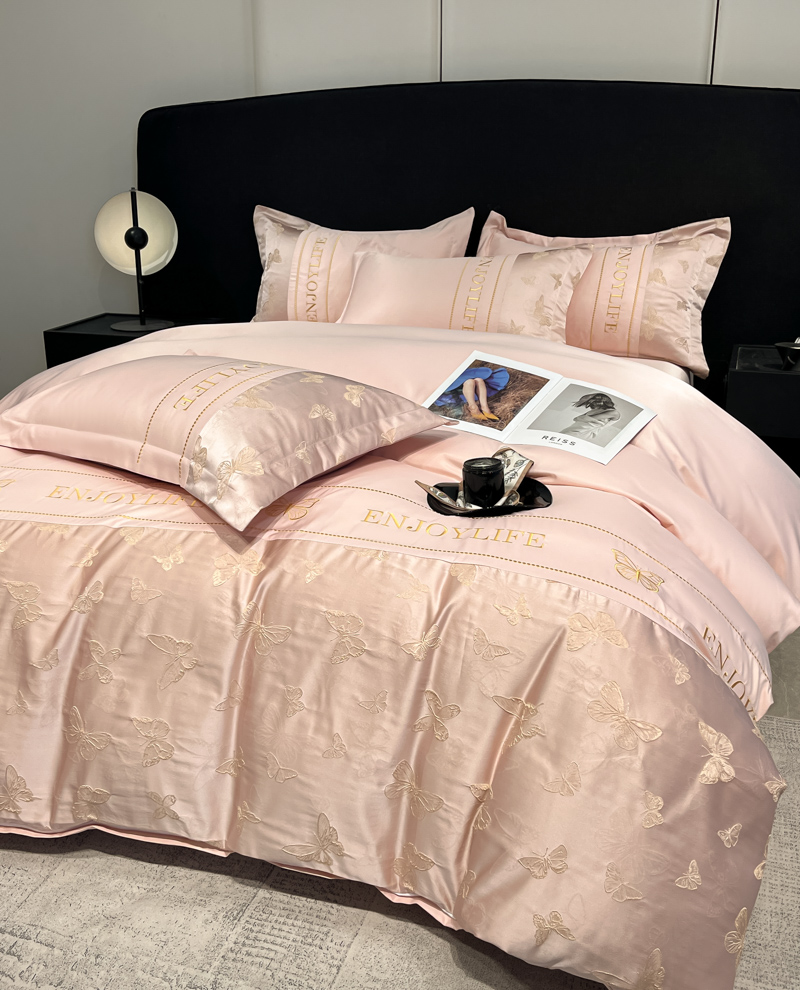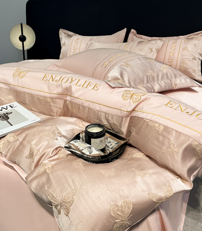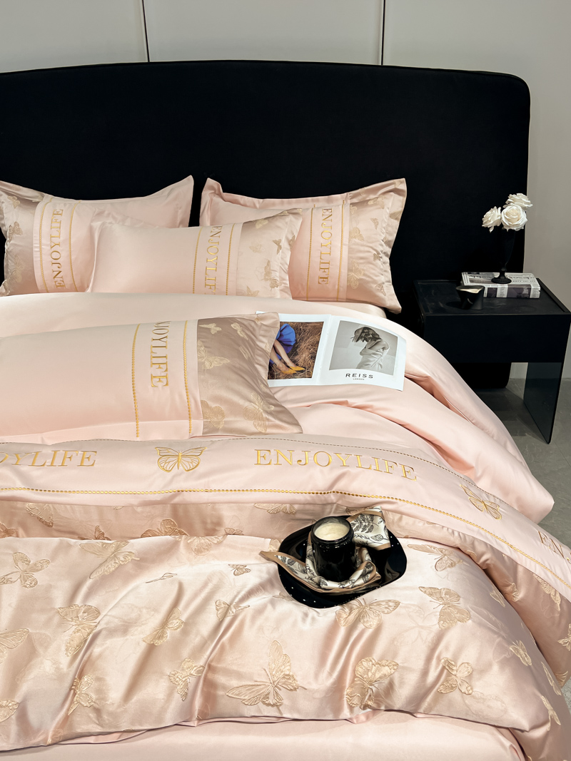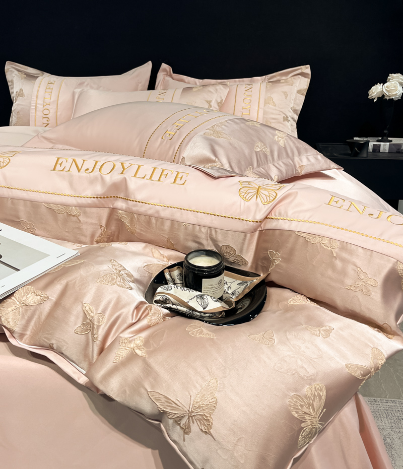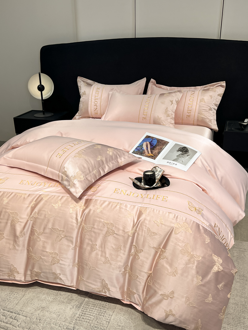 米彩家纺 2025新款A类水洗真丝金丝浮雕提花绣花四件套 富蝶-粉玉