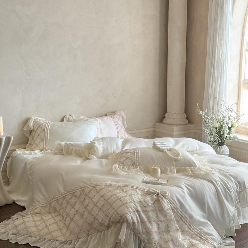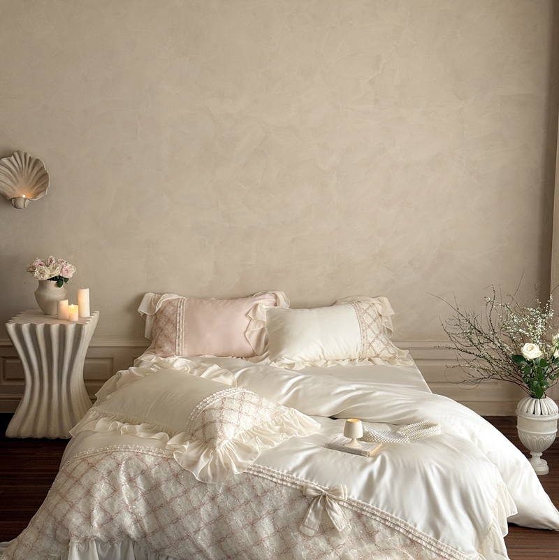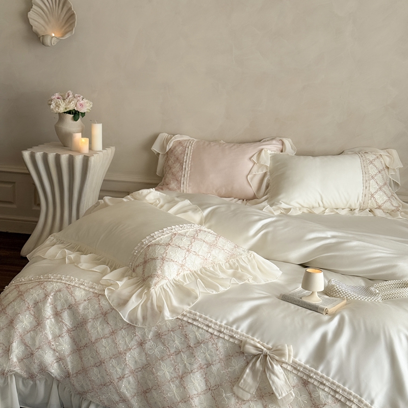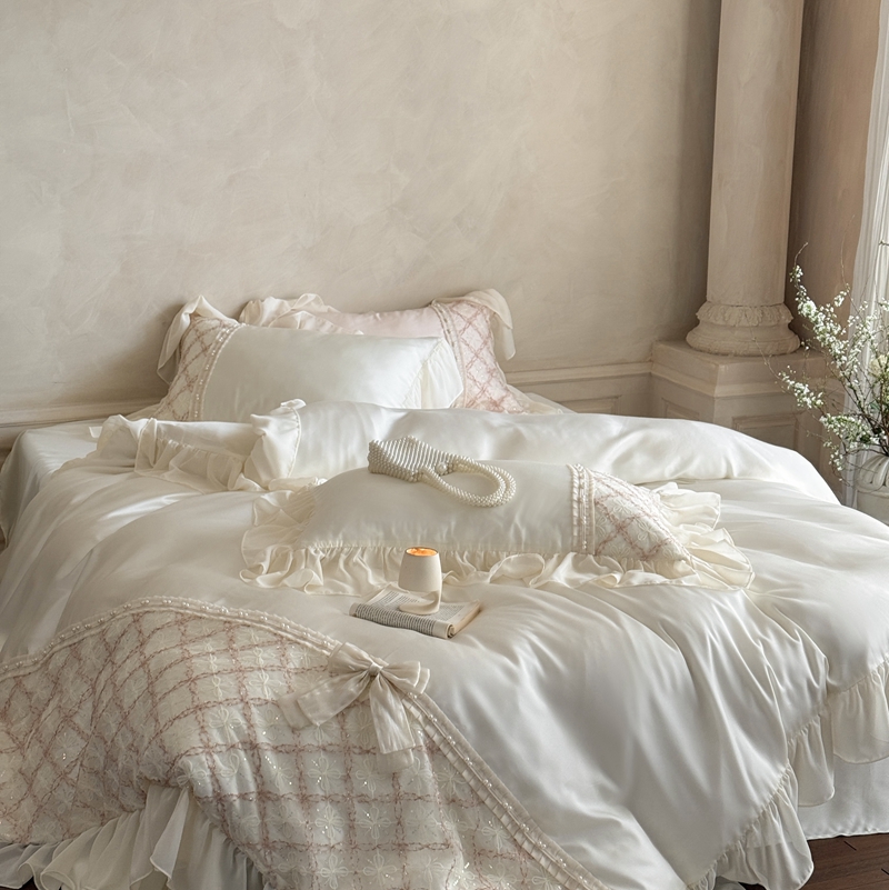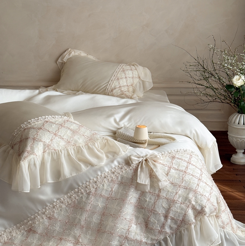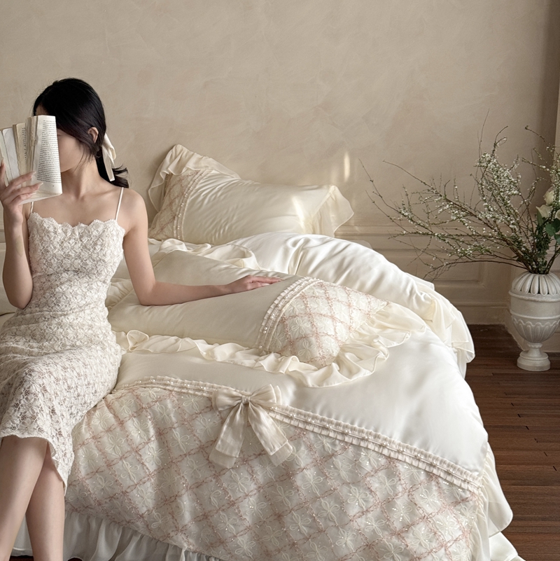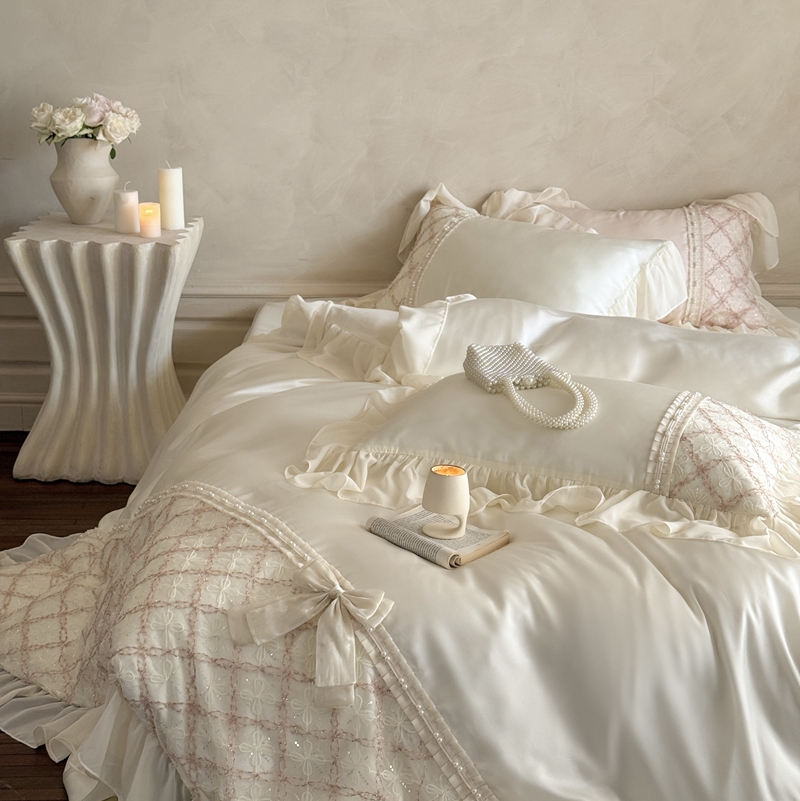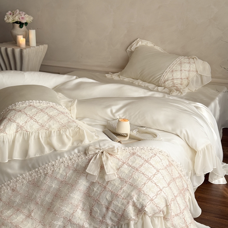 佳汐蓝家纺2025春夏新品60支兰精天丝珍珠织带蝴蝶结四件套--爱莎系列 奶白