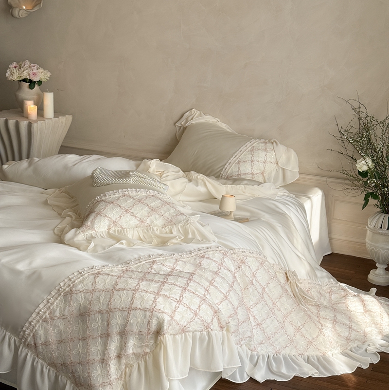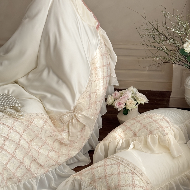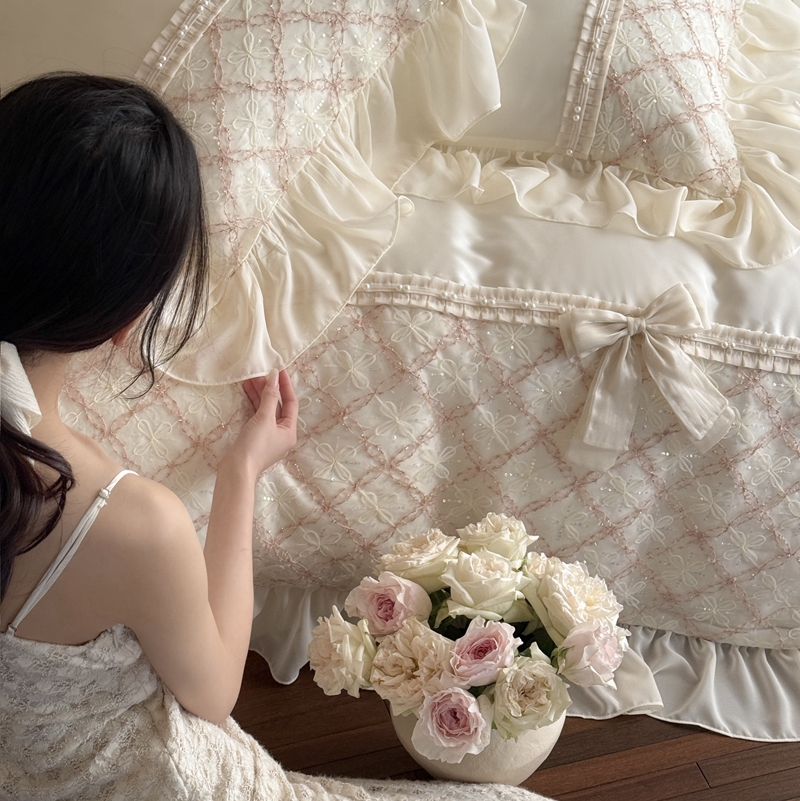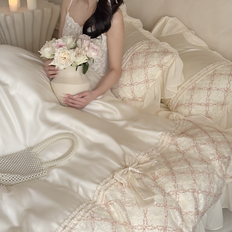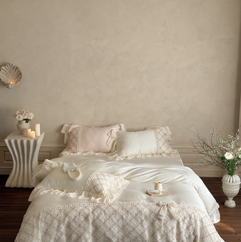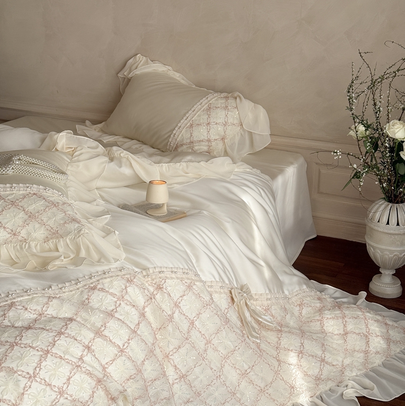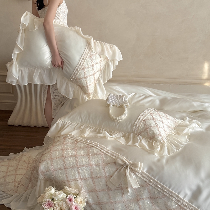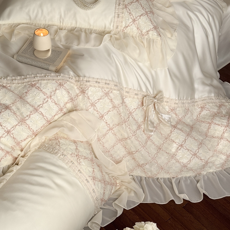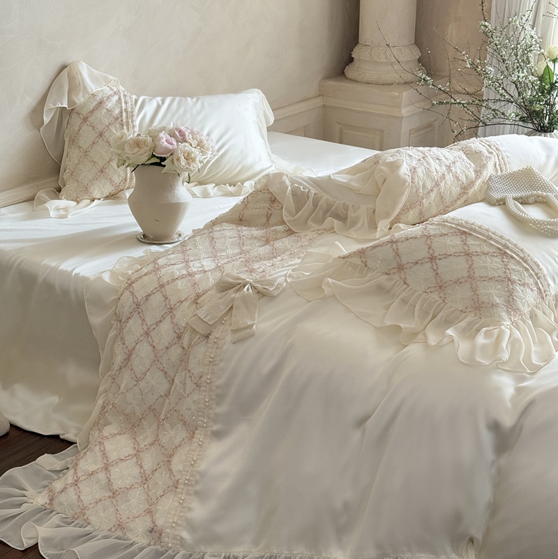 佳汐蓝家纺2025春夏新品60支兰精天丝珍珠织带蝴蝶结四件套--爱莎系列 奶白