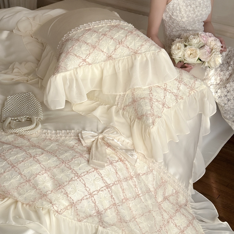 (总)佳汐蓝 2025春夏新品双层皱皱纱刺绣+织带+荷叶边四件套--白茶花,奶白,曲奇