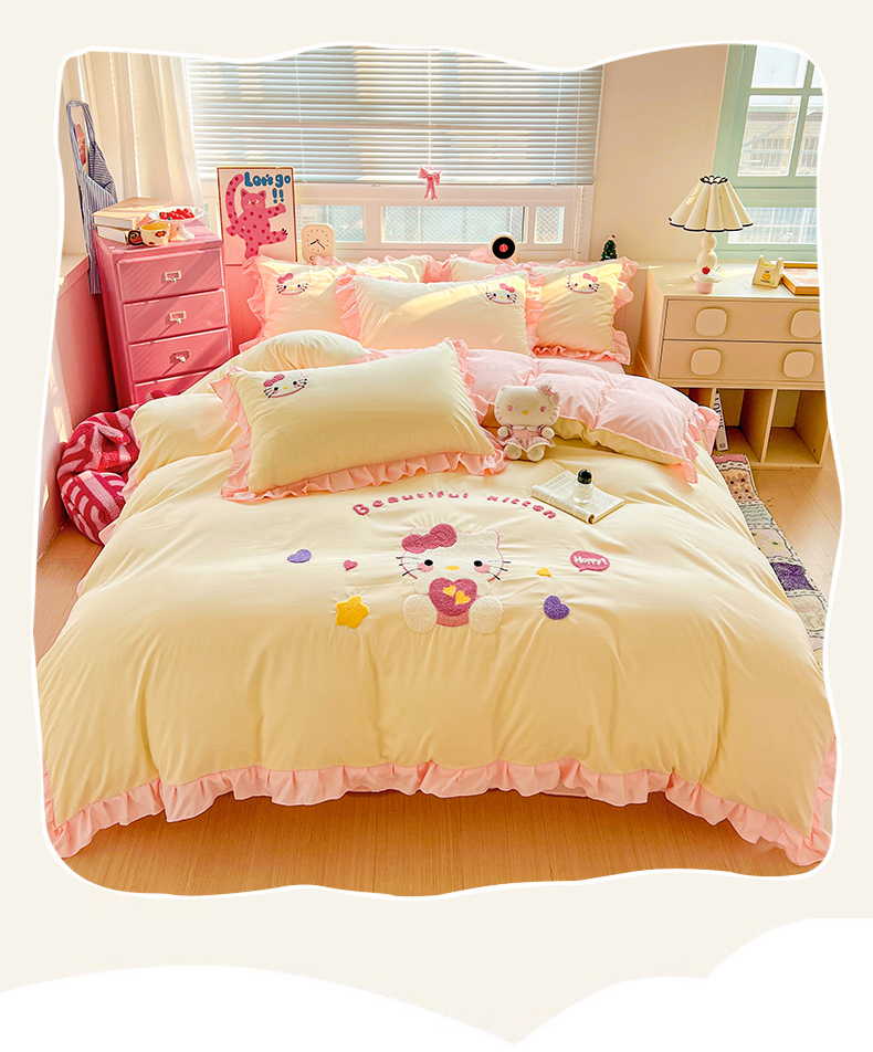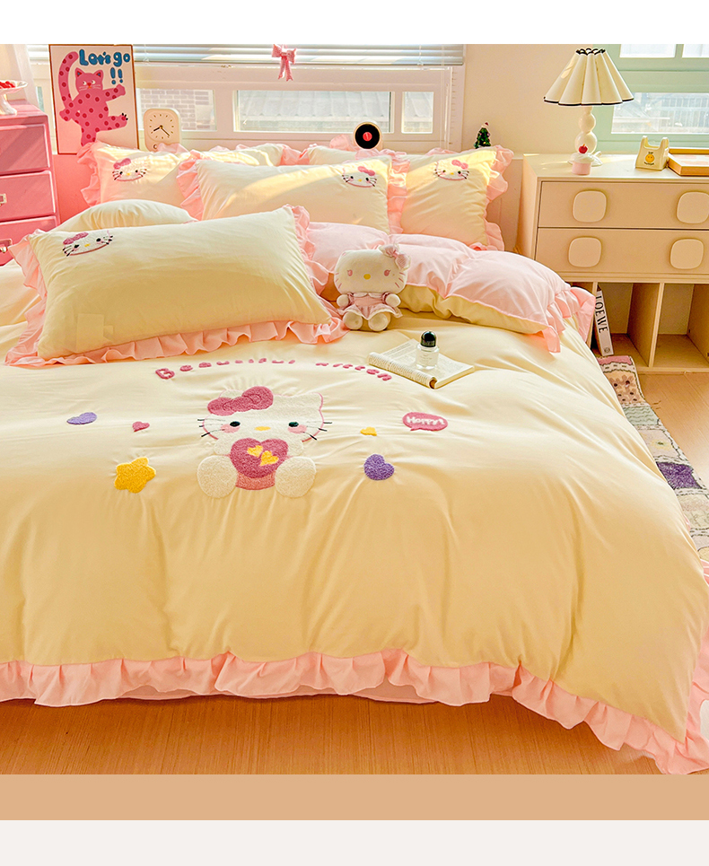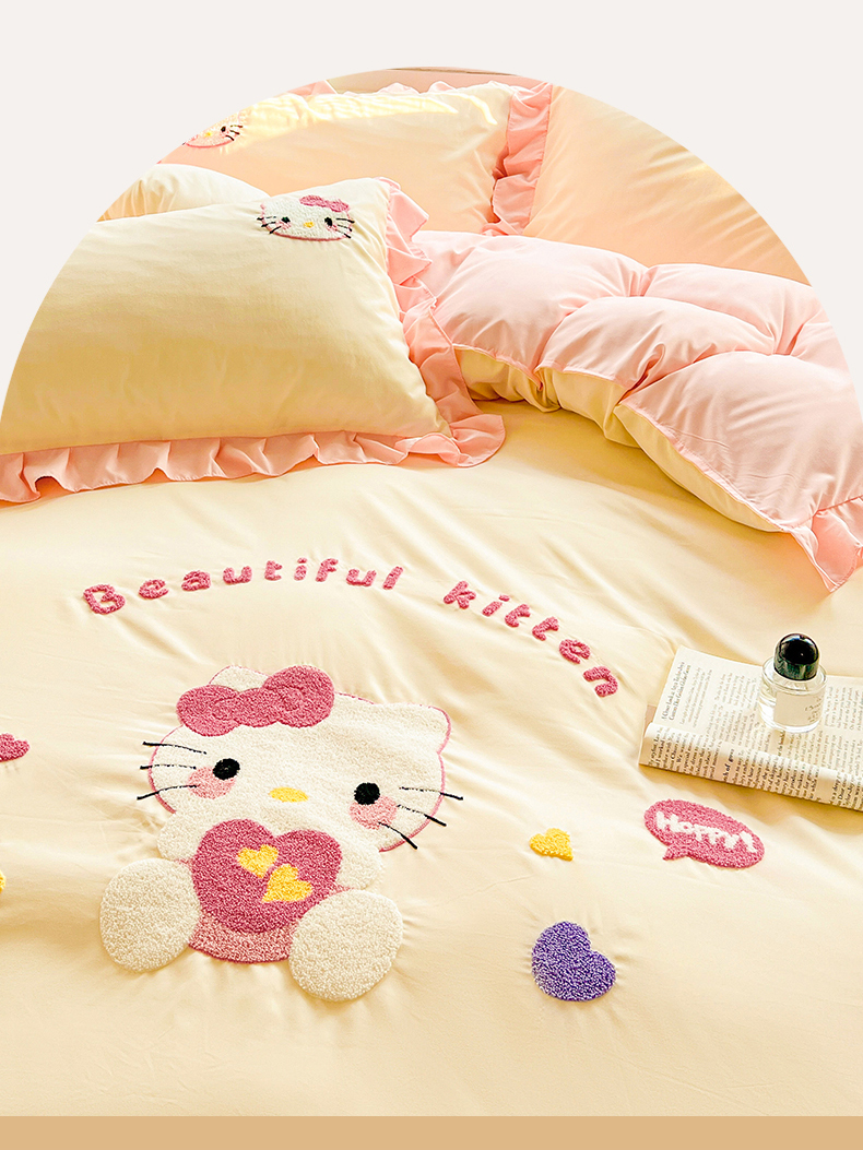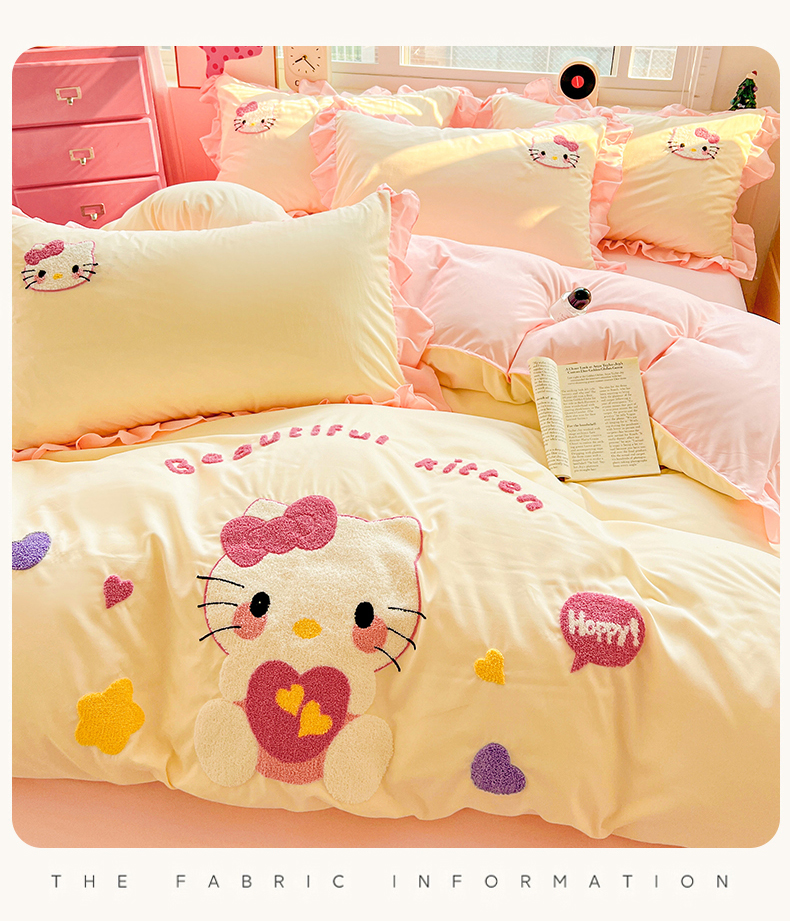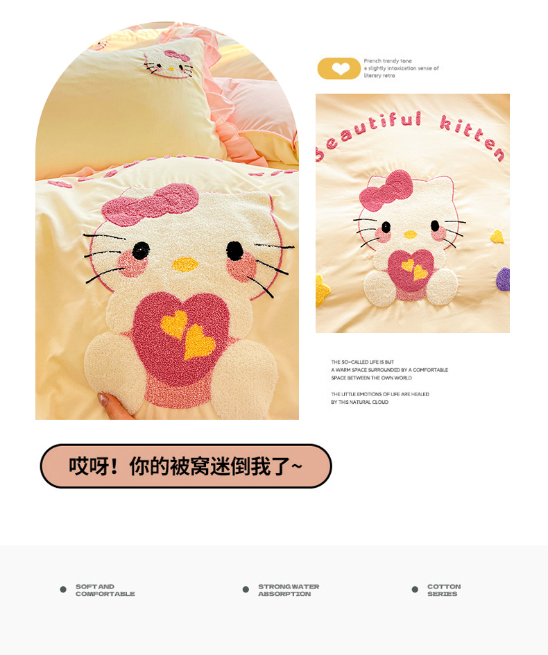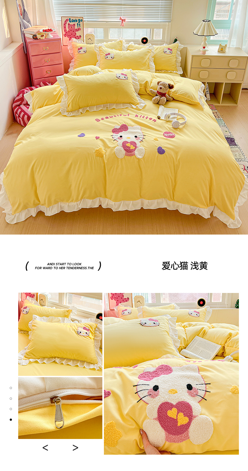 商品名称:雨菲家纺 2025新款水洗棉毛巾绣萌趣花边四件套--爱心猫蝴蝶结樱桃 爱心猫 奶黄粉