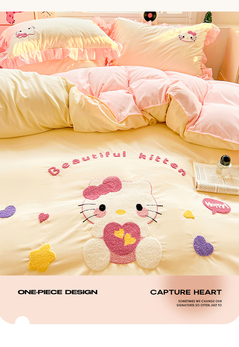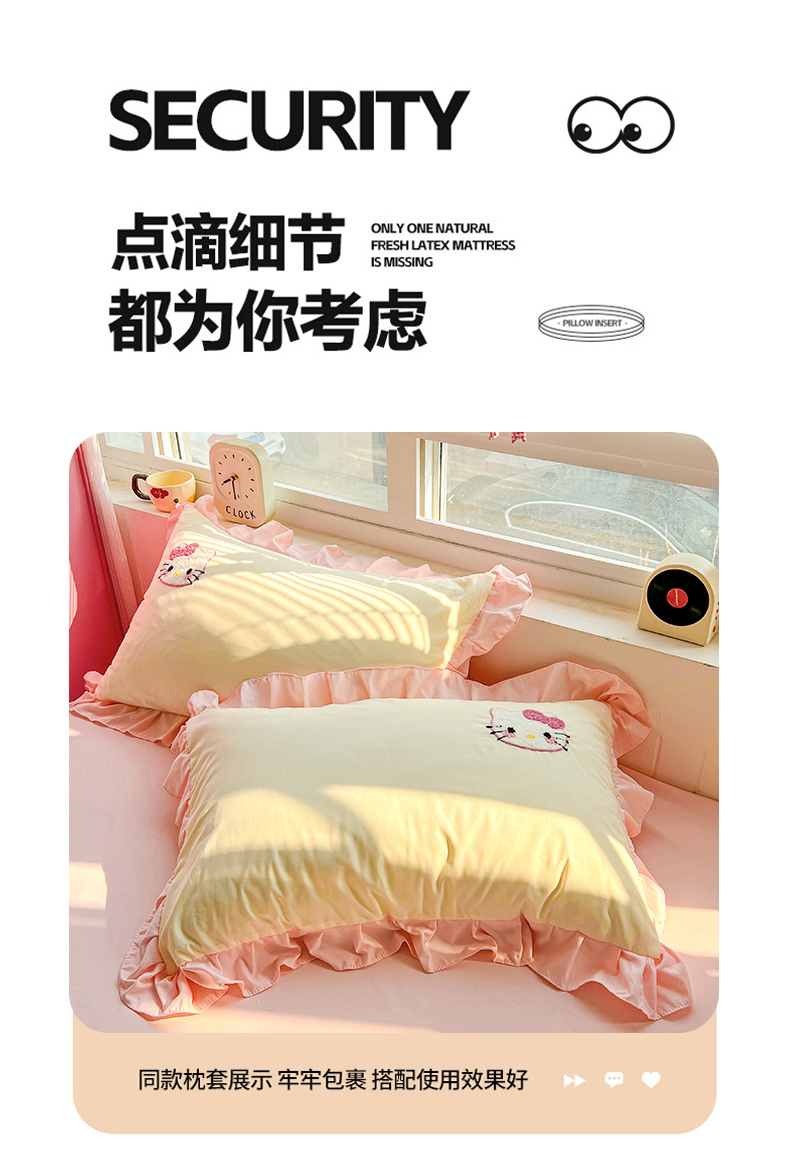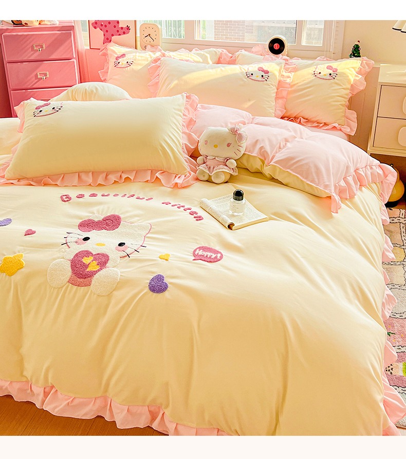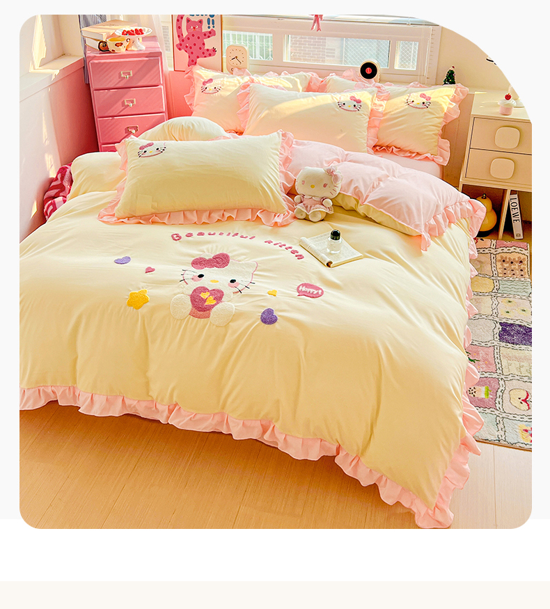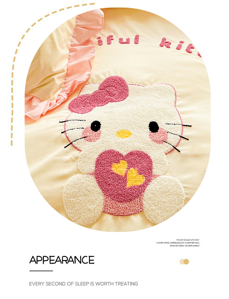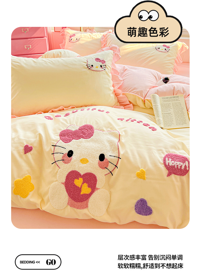 商品名称:雨菲家纺 2025新款水洗棉毛巾绣萌趣花边四件套--爱心猫蝴蝶结樱桃 爱心猫 奶黄粉