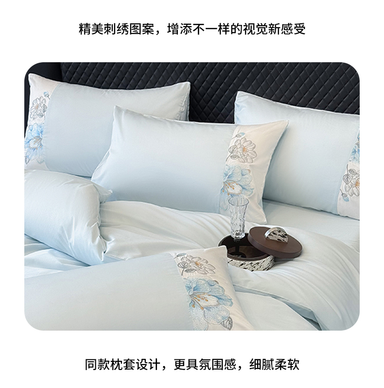 (总)绒棉世家 2025独家新款设计款高克重牛奶绒贴布绣四件套-花颜如梦系列,花颜如梦-淡蓝