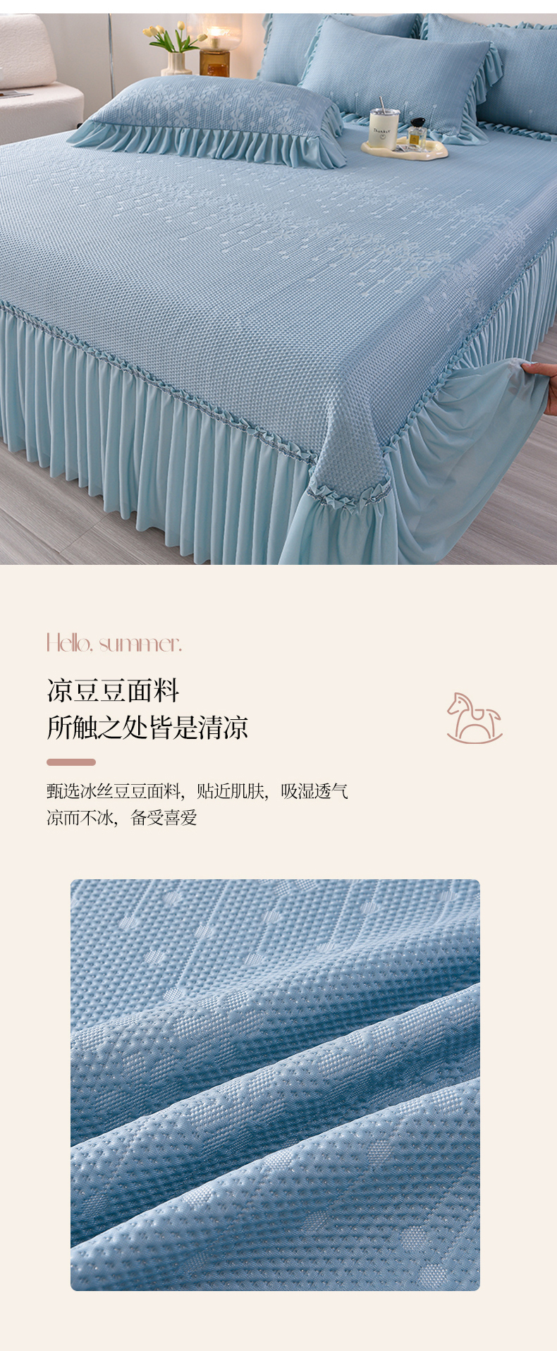 畅畅家纺 2025新款立体提花凉豆豆席床裙款凉席 幸运草-蓝