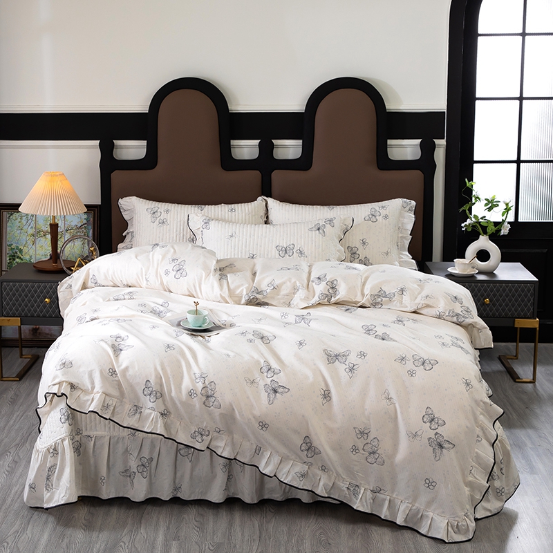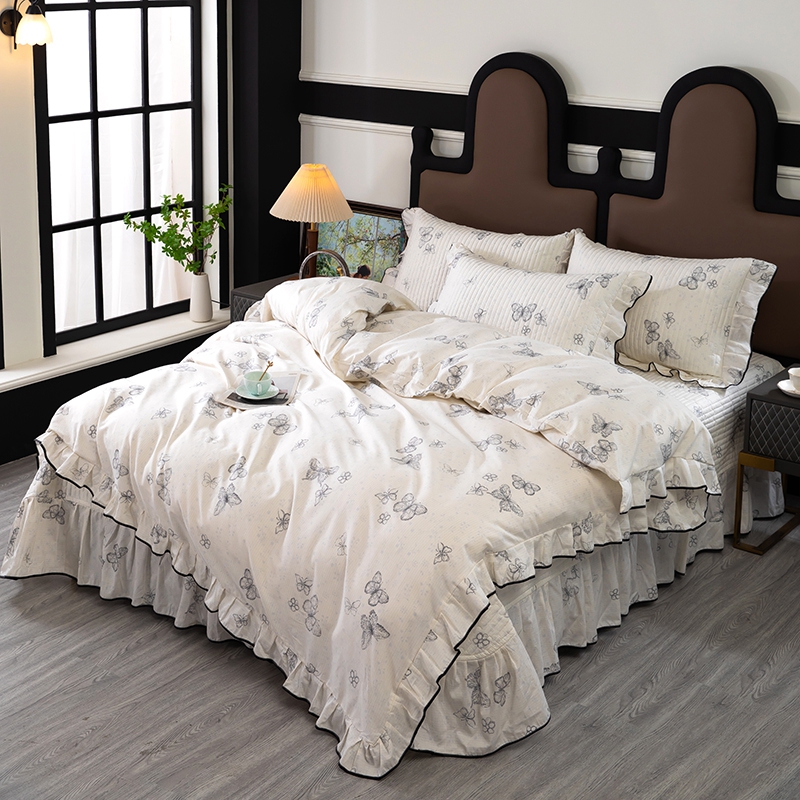 木兰花2025新款全棉印花法式韩版花边夹棉床盖床裙款四件套 苏菲