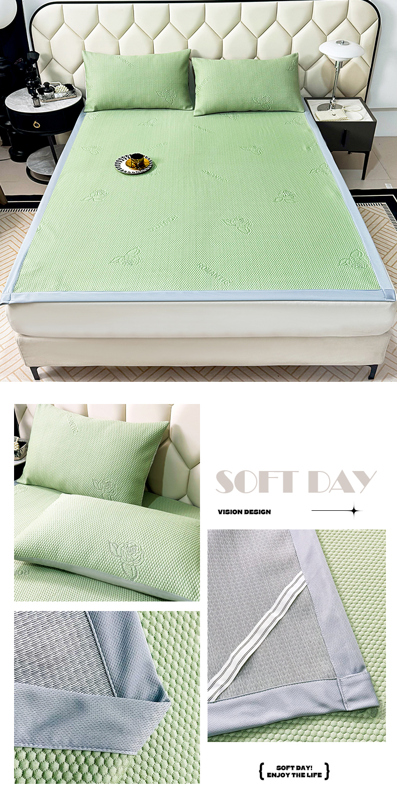 商品名称:席皇后 2025新款亲肤简约纯色豆豆床裙款凉席 玫瑰花-绿