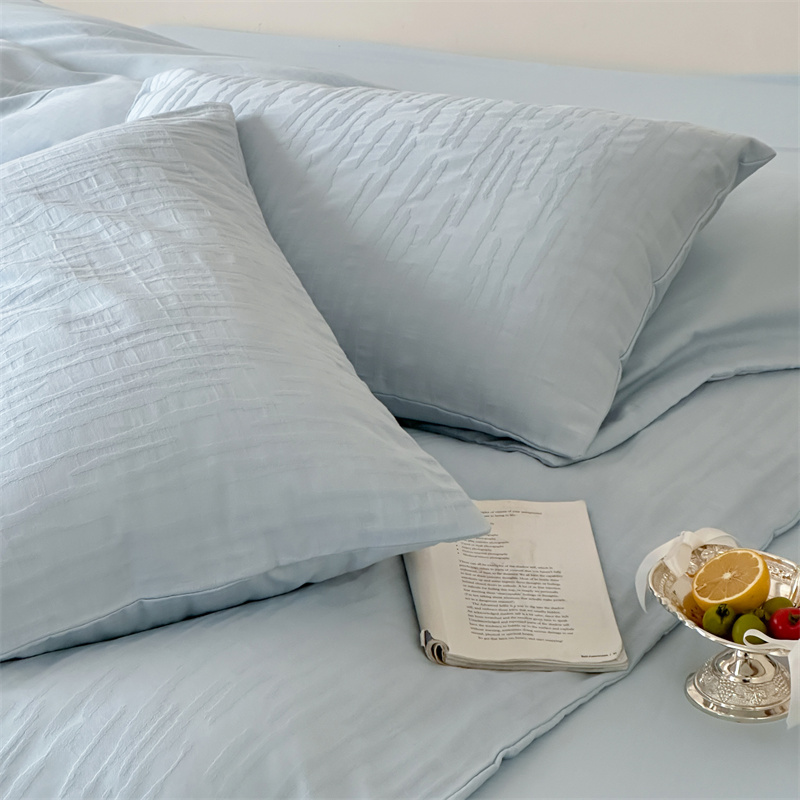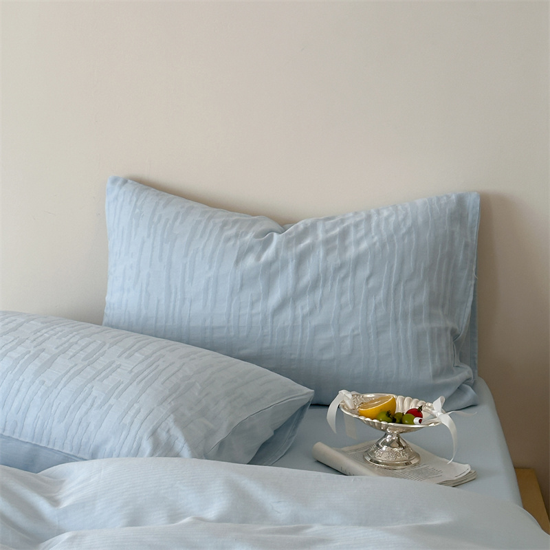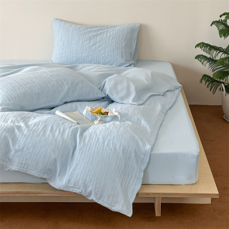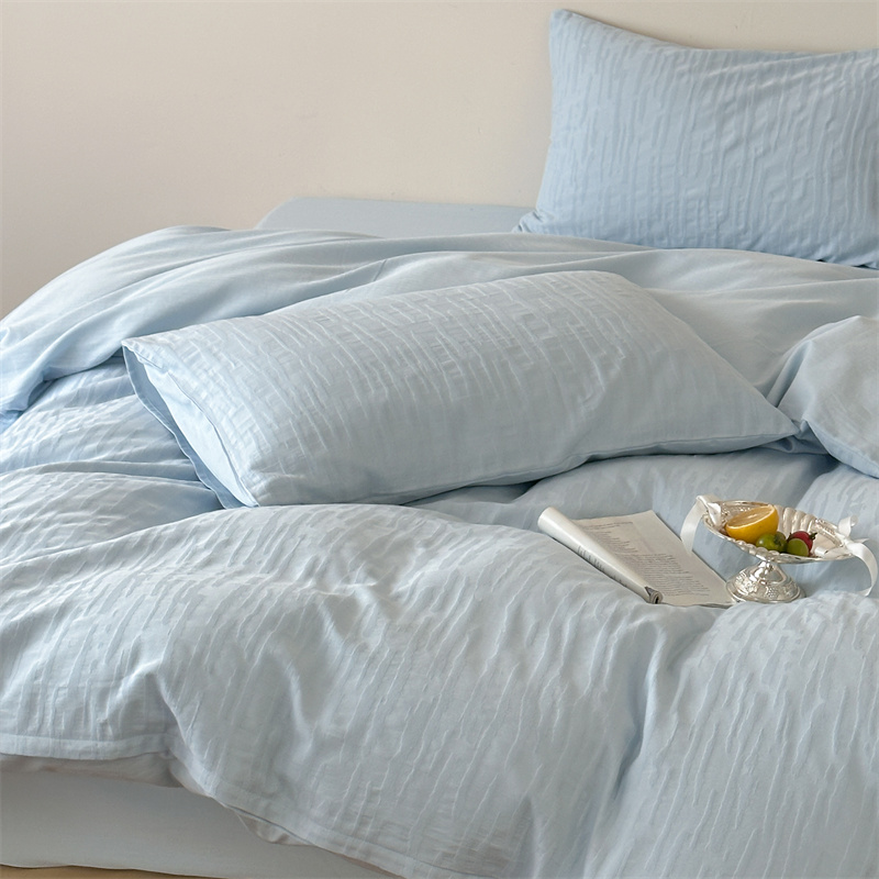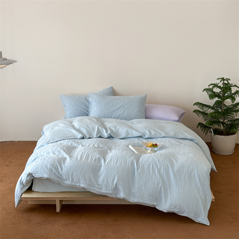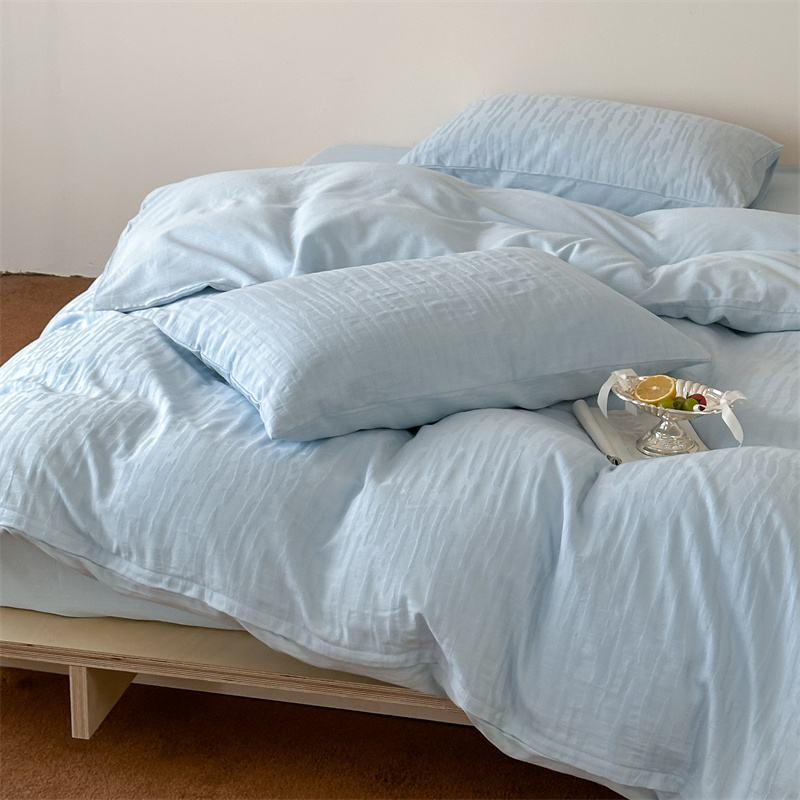 商品名称:小春日和 纯棉色织双层纱四件套提花被套纯色加大床单1.8床笠民宿风高端不规则条纹四件套 觅光-兰