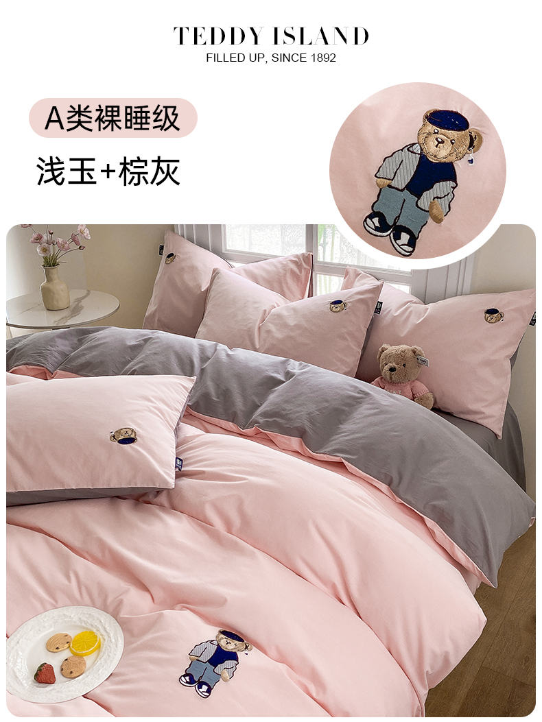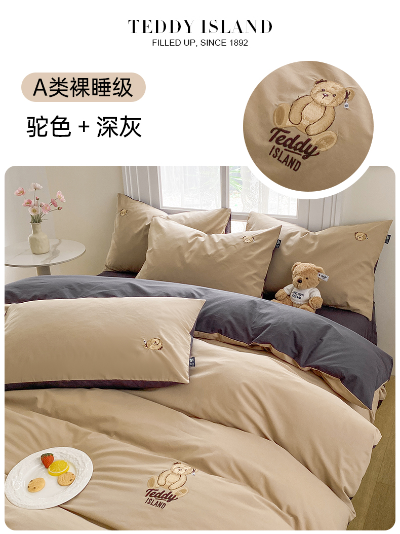 (总)泰迪爱兰Teddy ISLAND 2025新款牛奶绒绣花四件套,粉色+杏仁色,可可色+杏仁色,雾霾灰+神秘灰,香芋紫+神秘灰,杏仁色+可可色,杏仁色+神秘灰