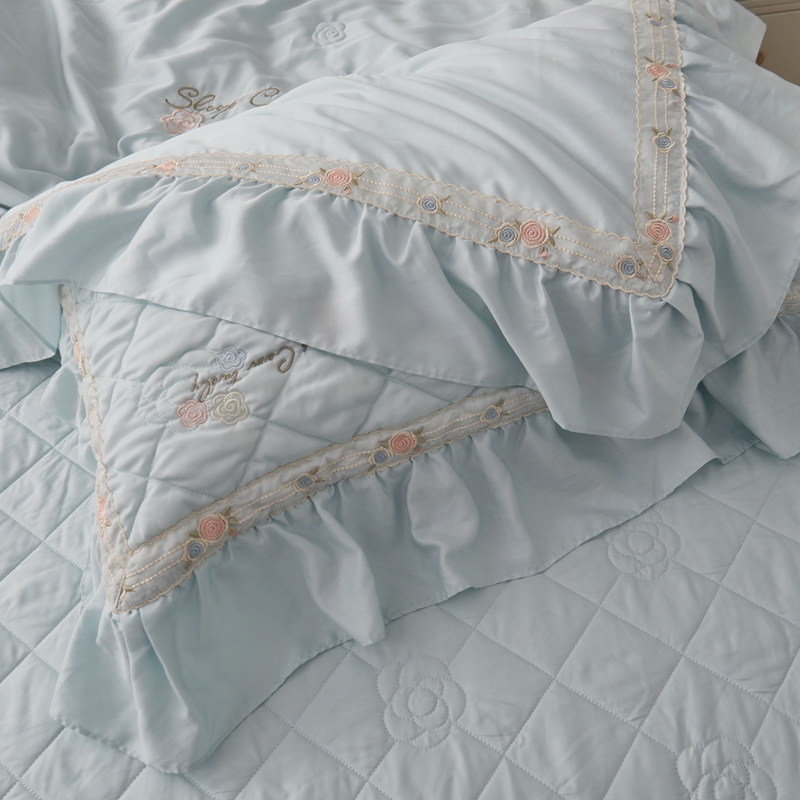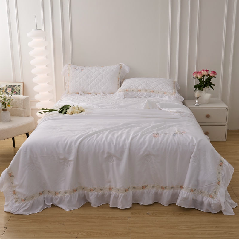 (总)2025新款50莱赛尔双面天丝床盖三件套,山茶花粉,山茶花蓝,山茶花白,山茶花黄