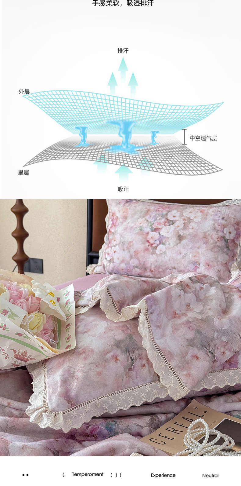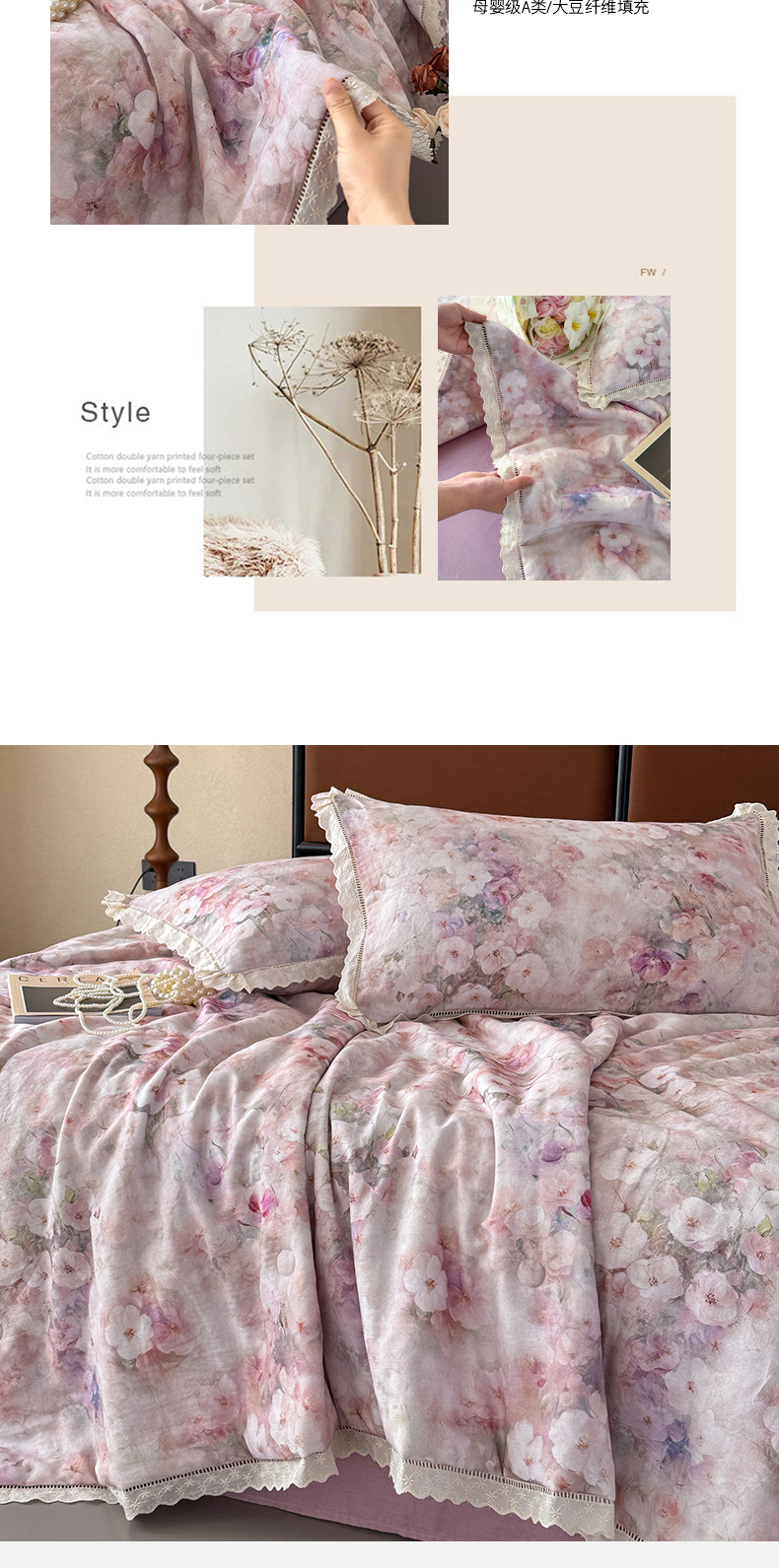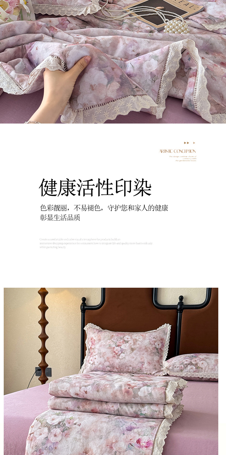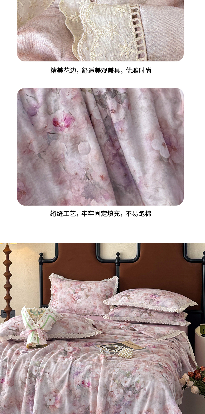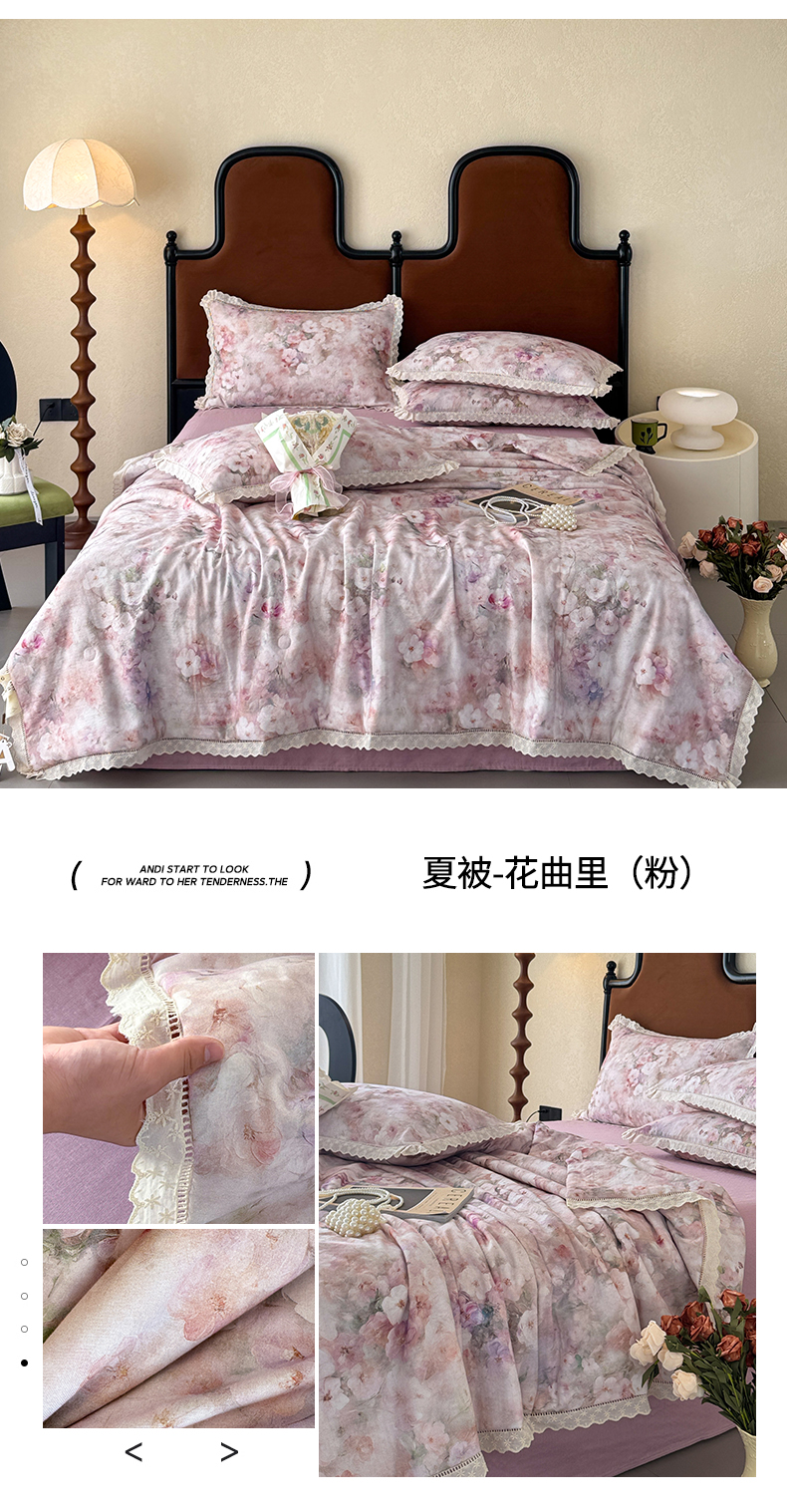 • 91家纺网 家纺一手货源 找家纺 眠博士2025新款双层纱印花法式花边夏被  夏被-花曲里(粉)