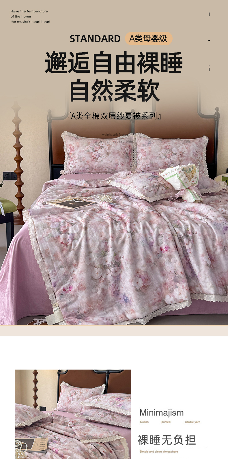 眠博士2025新款双层纱印花法式花边夏被 夏被-花曲里(粉)
