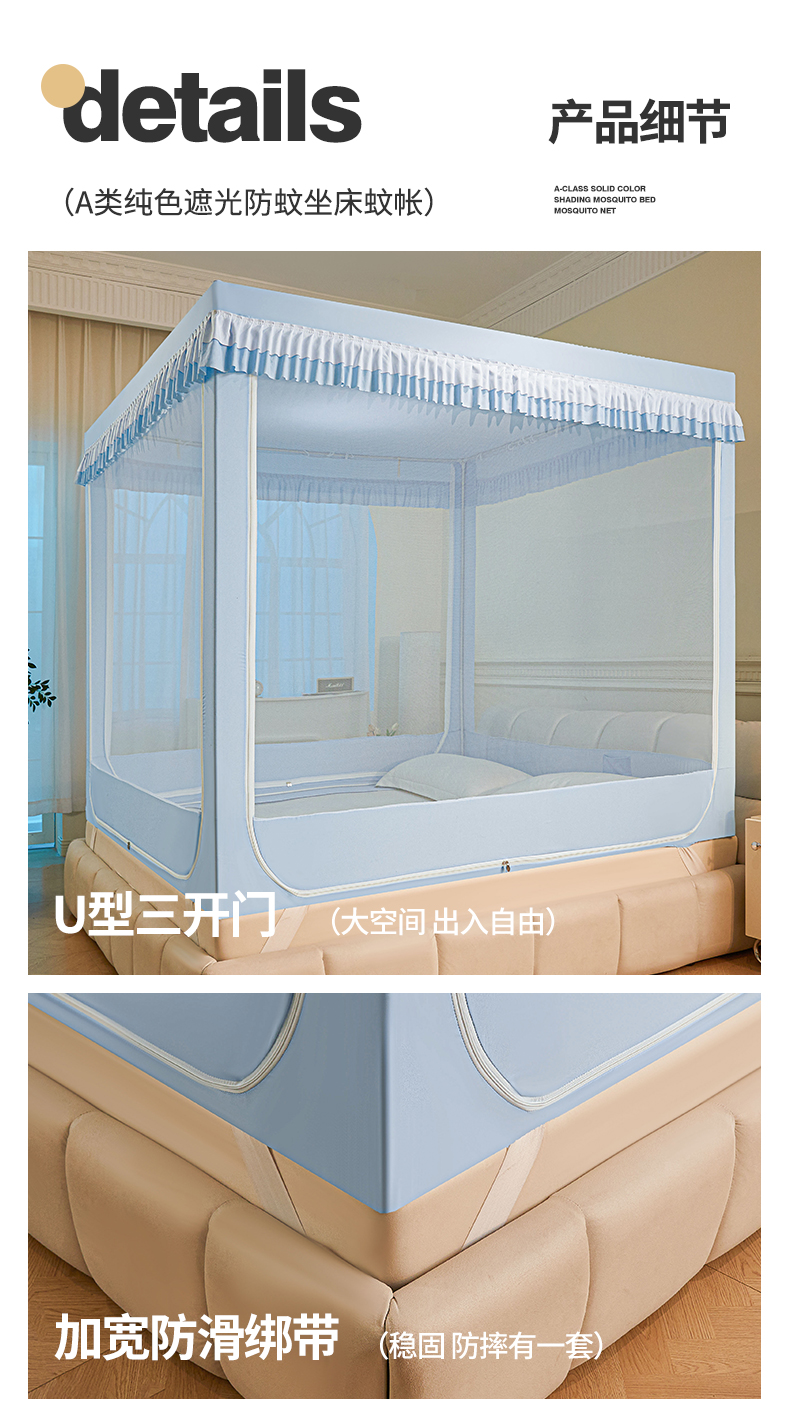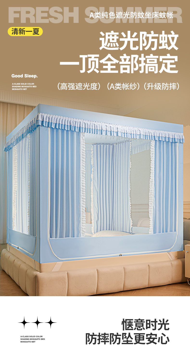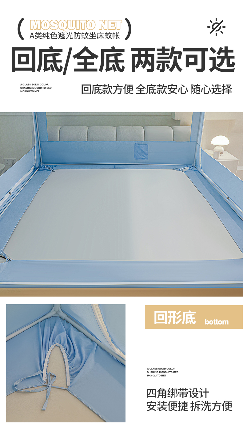 当前位置: 91家纺网 > 商品网购 > 床上用品 > 蚊帐 > 坐床式蚊帐 > 浪幔纱蚊帐 2025新款A类遮光防摔蚊帐坐床拉链全底回底纯色加厚支架 舒雅蓝【全底无帘款】