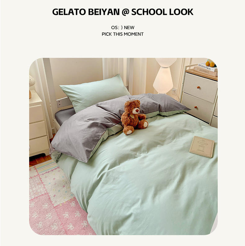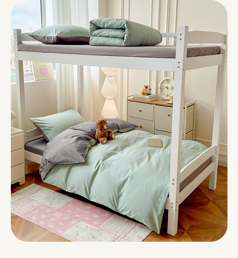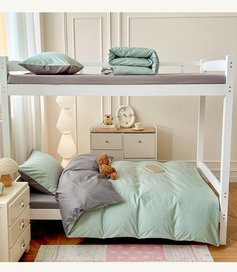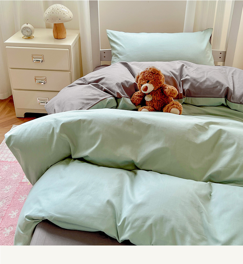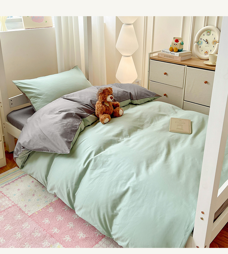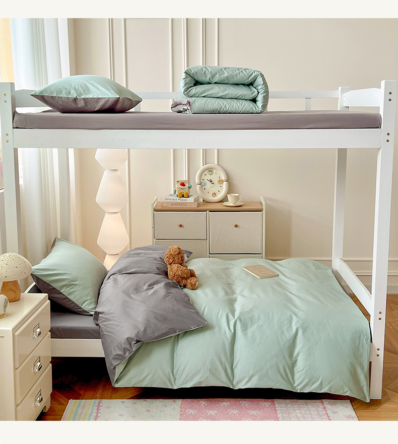 商品名称:泽西家纺 2025新款A类加密全棉40支13376简约风宿舍双拼纯色纯棉学生三件套 豆绿+高级灰