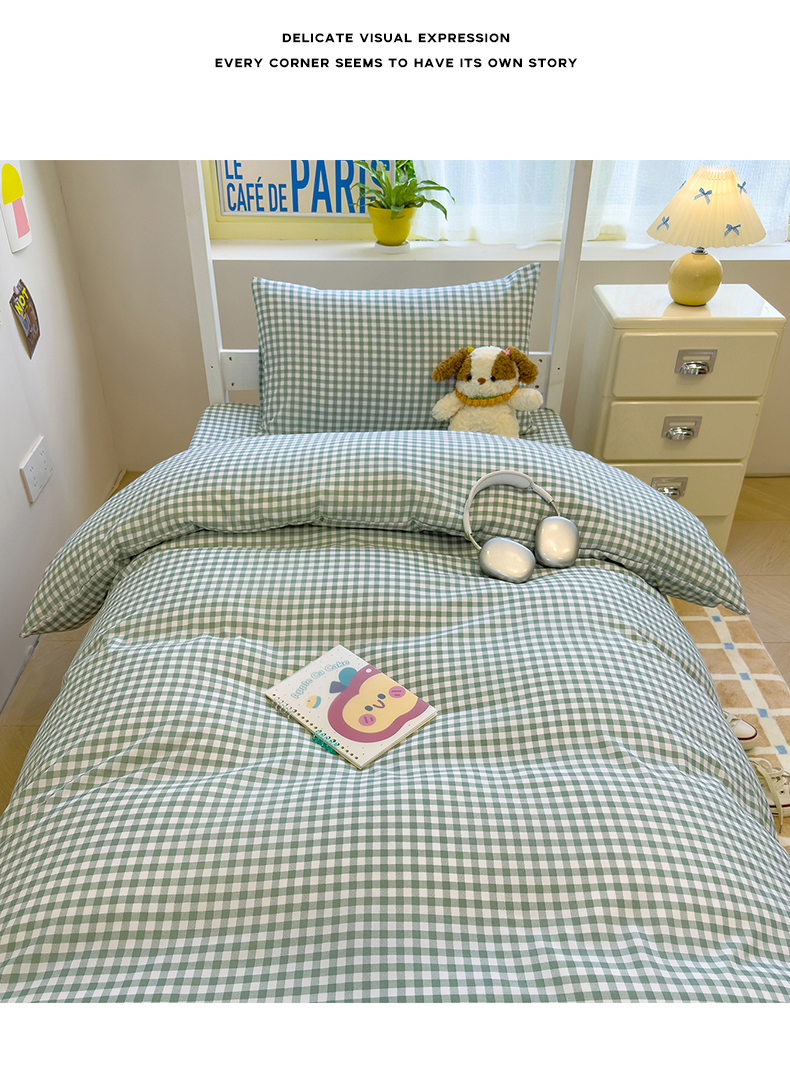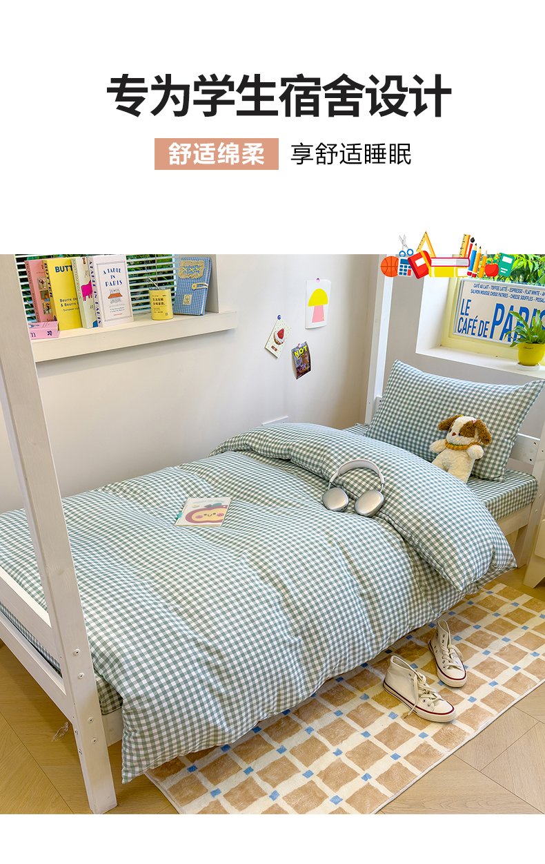 蓝冰家纺 2025新款学生水洗棉宿舍上下铺三件套 绿白小格