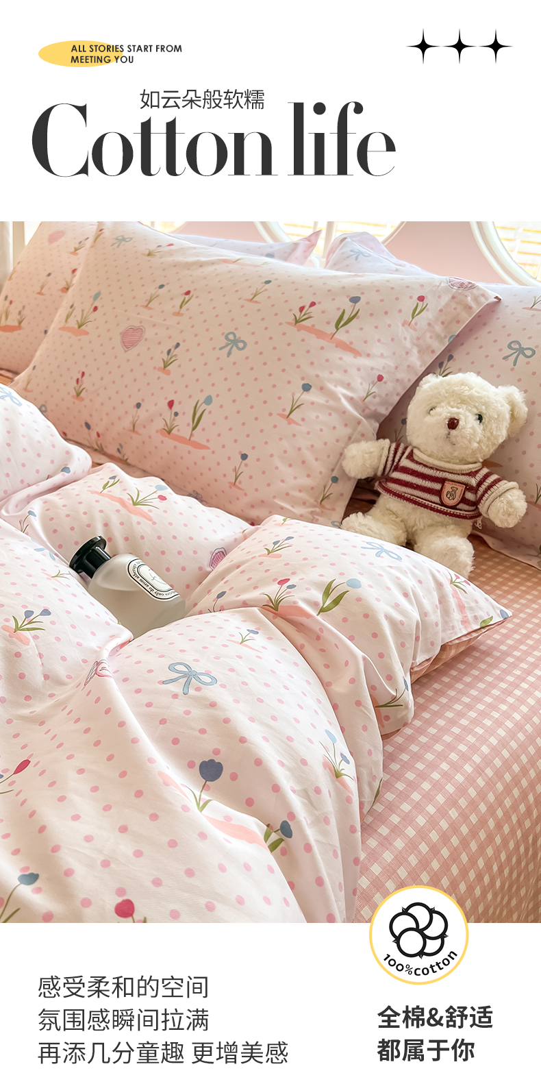 西域种棉人·千百笠 2025新款全棉纯棉大学生宿舍100%新疆棉花被子被褥一整套枕头床垫三件套六件套 波点乐园 格子