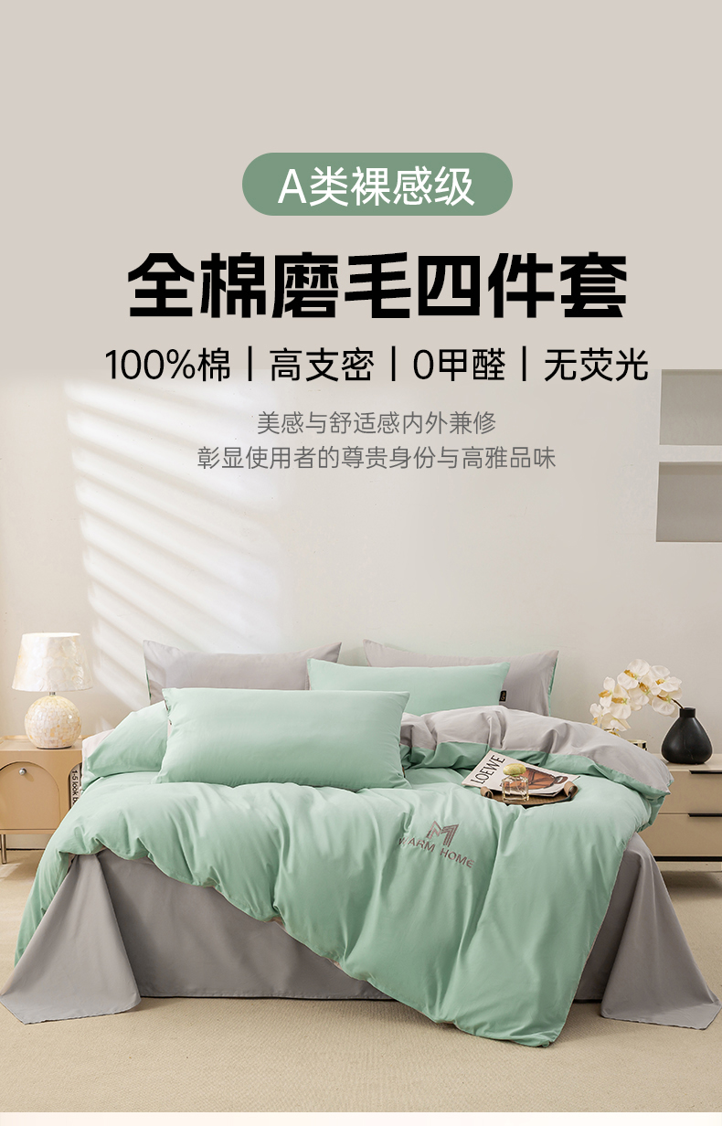 (总)憨豆家纺 2025新款秋冬全棉加厚磨毛四件套纯棉床单被套床笠纯色三件套(提供买家秀)