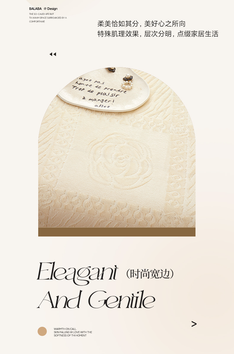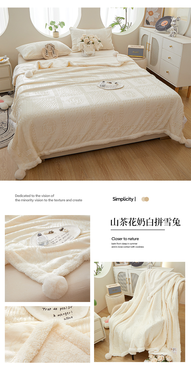 商品名称:楼兰公主2025新款雪兔绒小香风提花雕花毯 山茶花奶白拼雪兔
